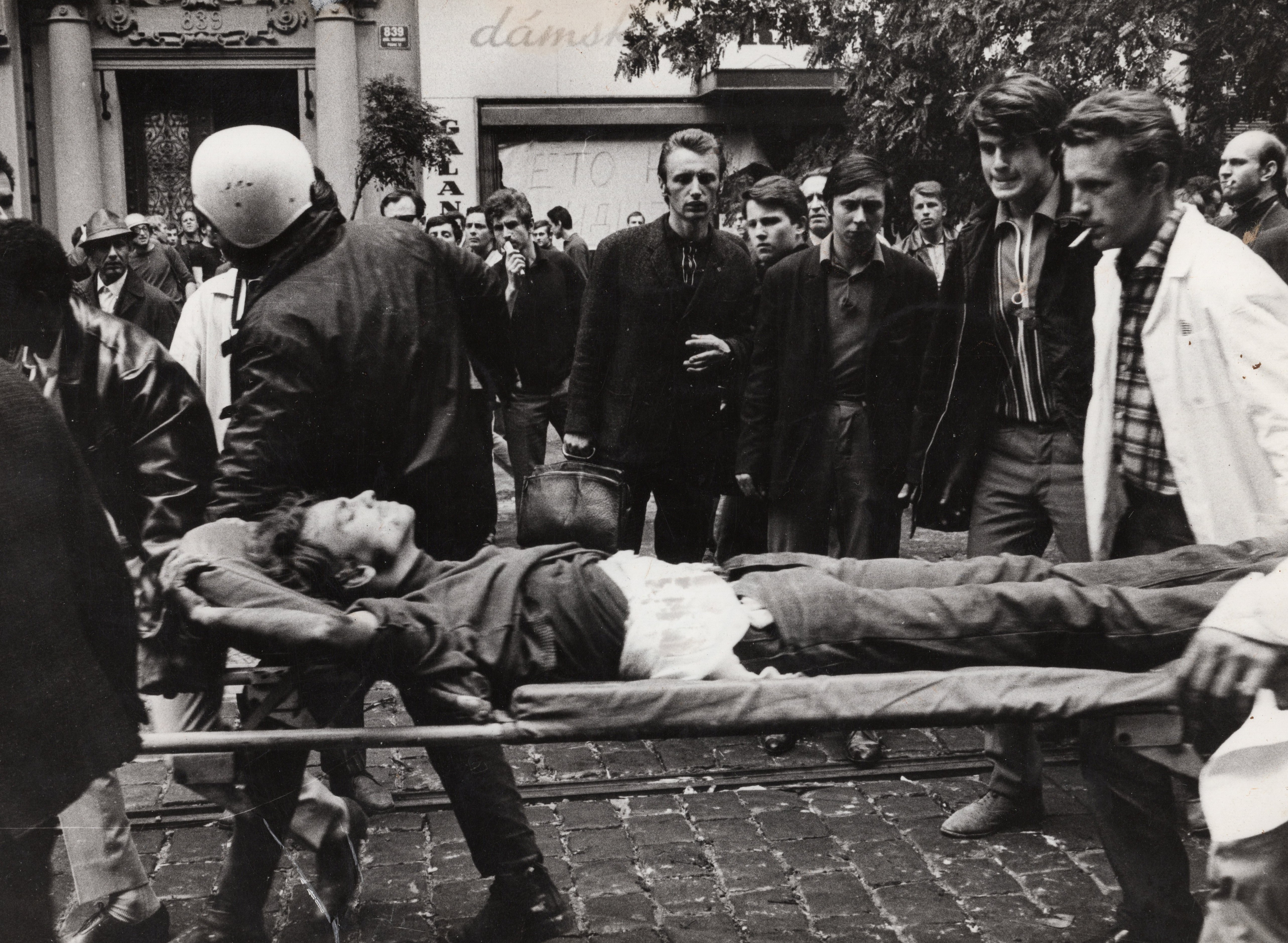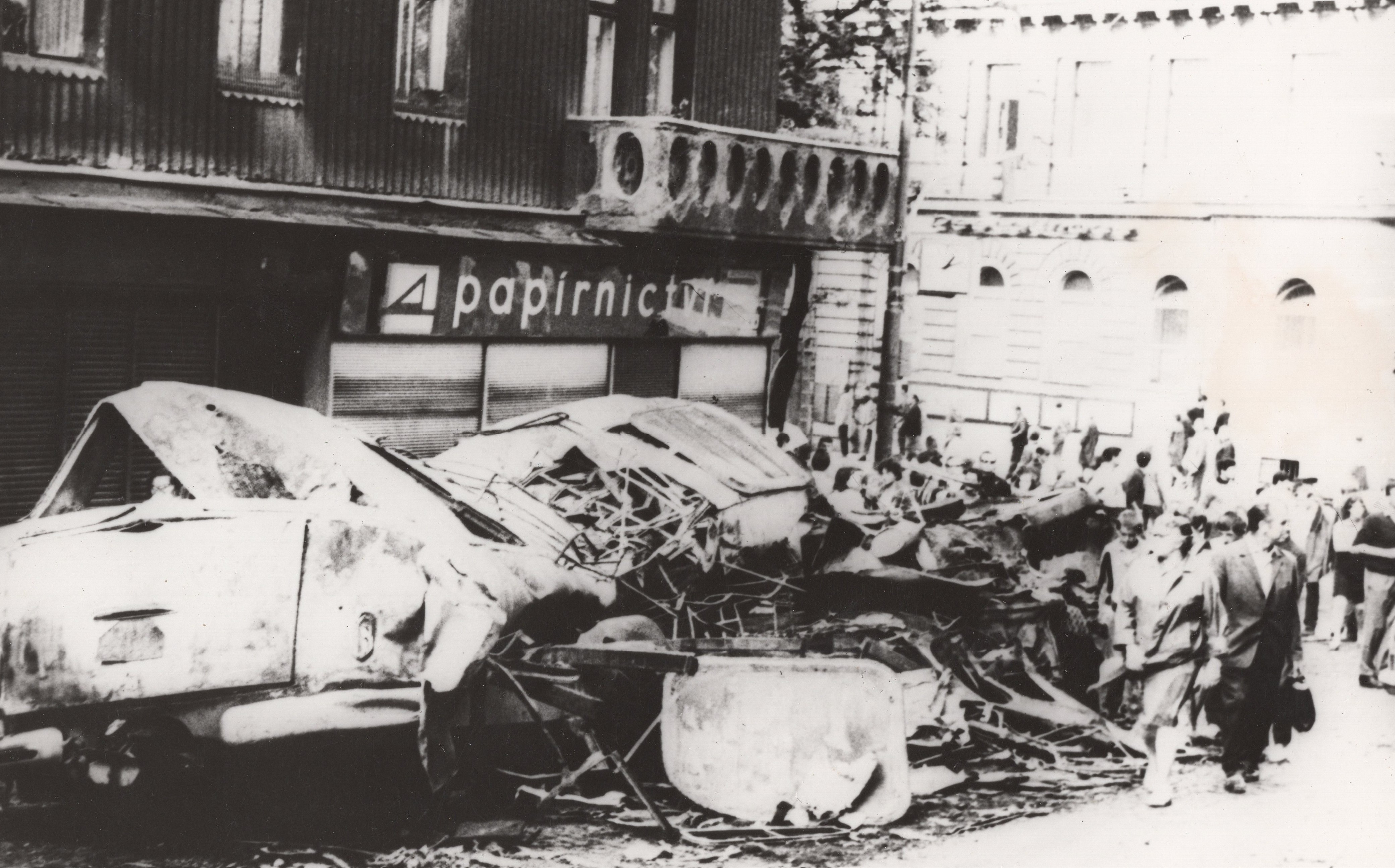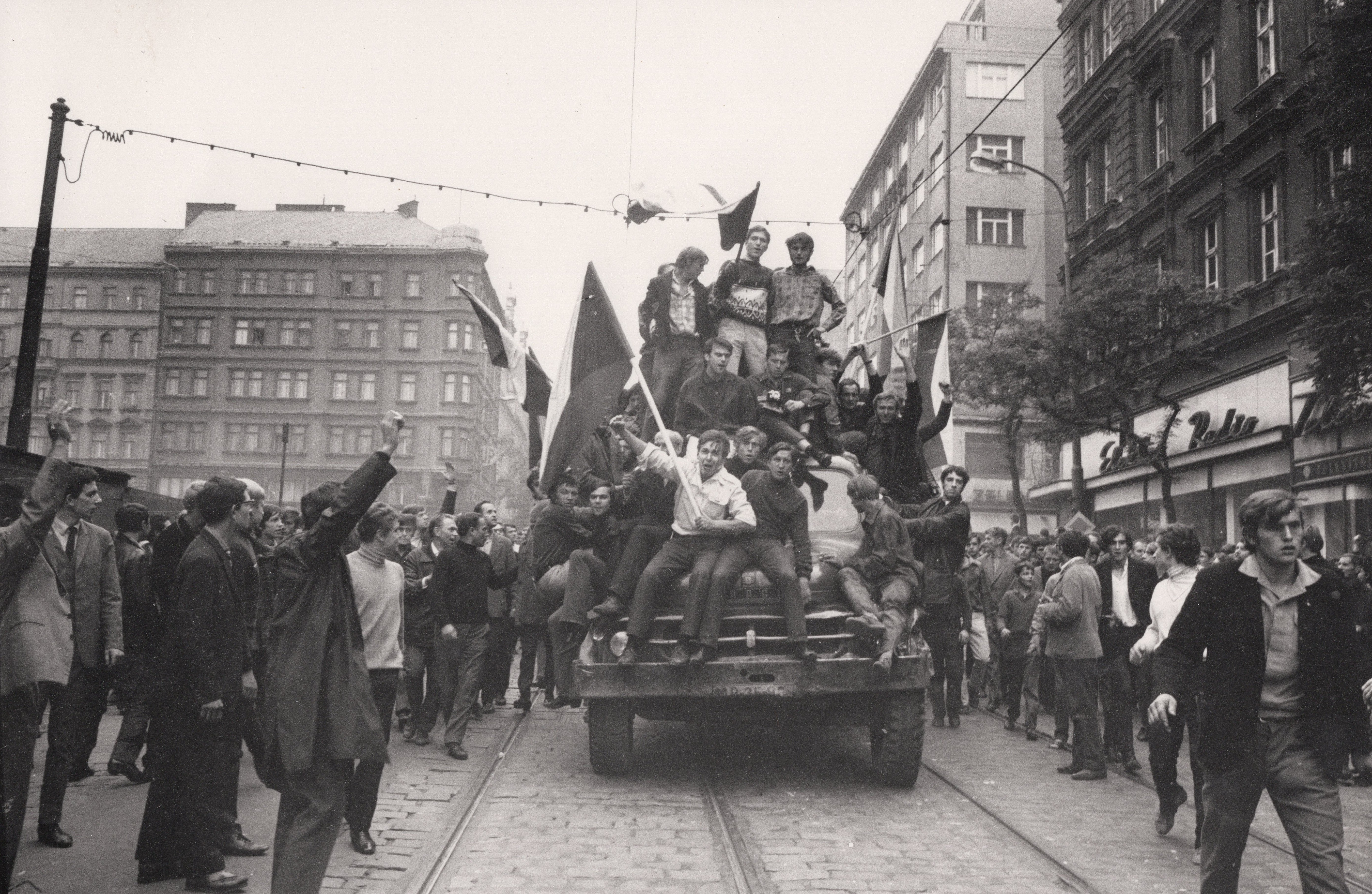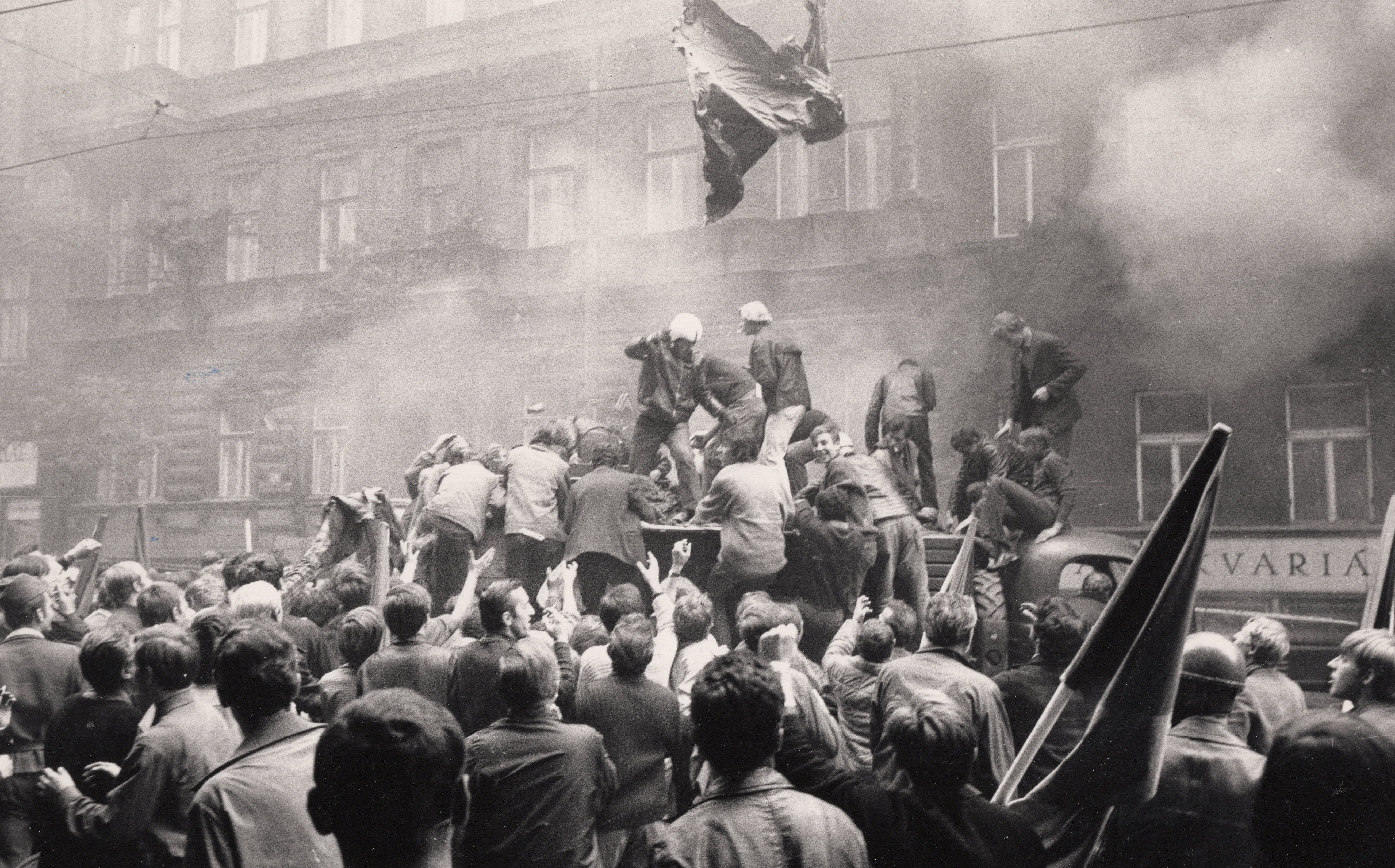 • „Šli jsme se podívat k rozhlasu, co se vůbec děje. A tak jsme byli u toho, ležely tam první oběti. Dva mrtví kluci, kteří byli napůl přikrytí, ve výklenku u rozhlasu. Stálo tam asi sedm ruských aut. Chtěli jsme jít zpátky do auta, jenže zrovna přijížděl tank. Na kraji přejel a rozdrtil autobus. A vpředu na tanku seděl střelec, vidím to jako dnes, byl to nějaký Turkmen. Pak nevím, co mě to napadlo, no skaut, tak jsem říkal: ‚Franto, ten tank na tu vlajku nevjede.‘ Tak jsem po ní skočil k chodníku, koupil jsem to do ruky ze samopalu. Vlajku jsem si dal do podpaží a utíkali jsme se schovat.“