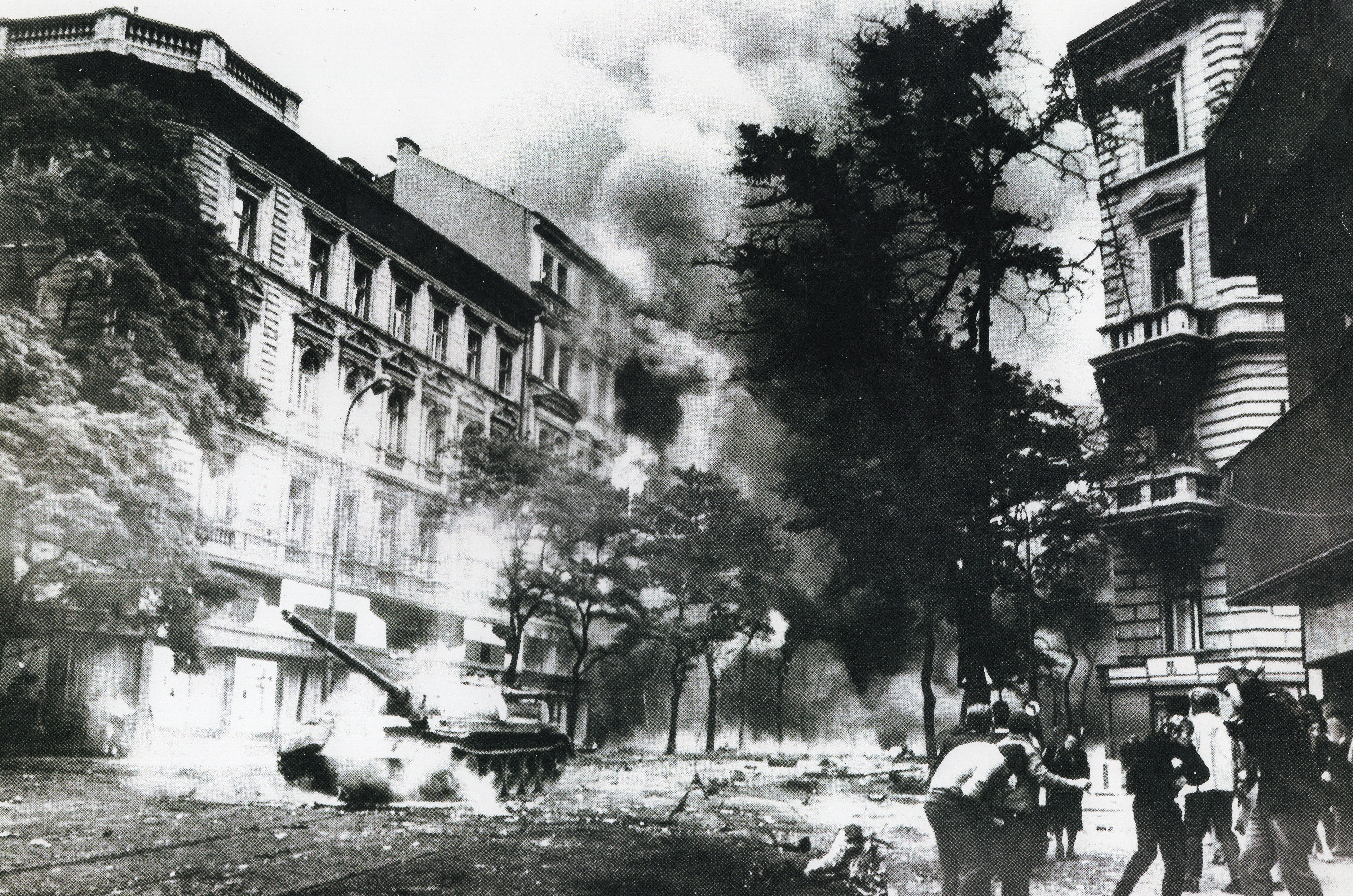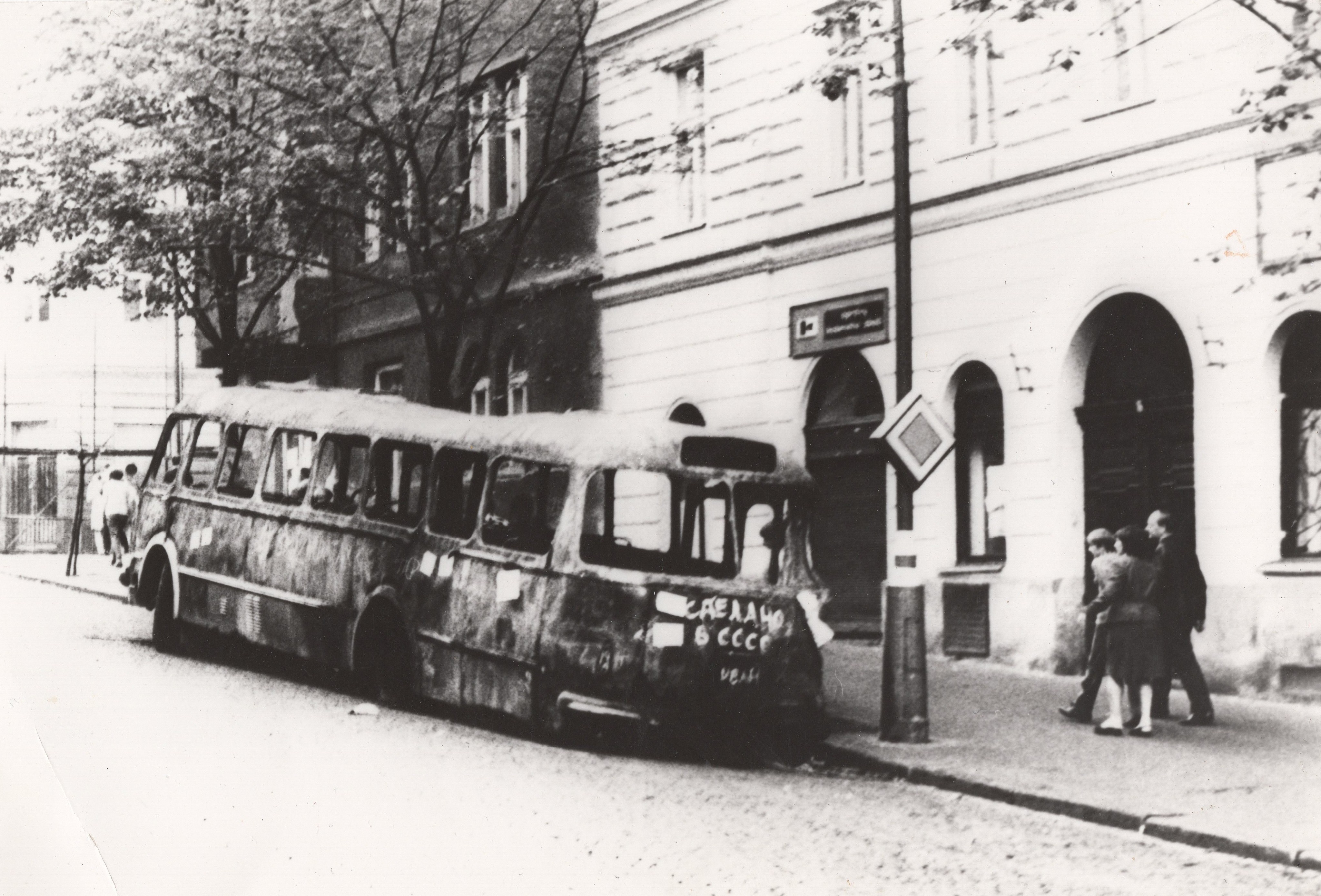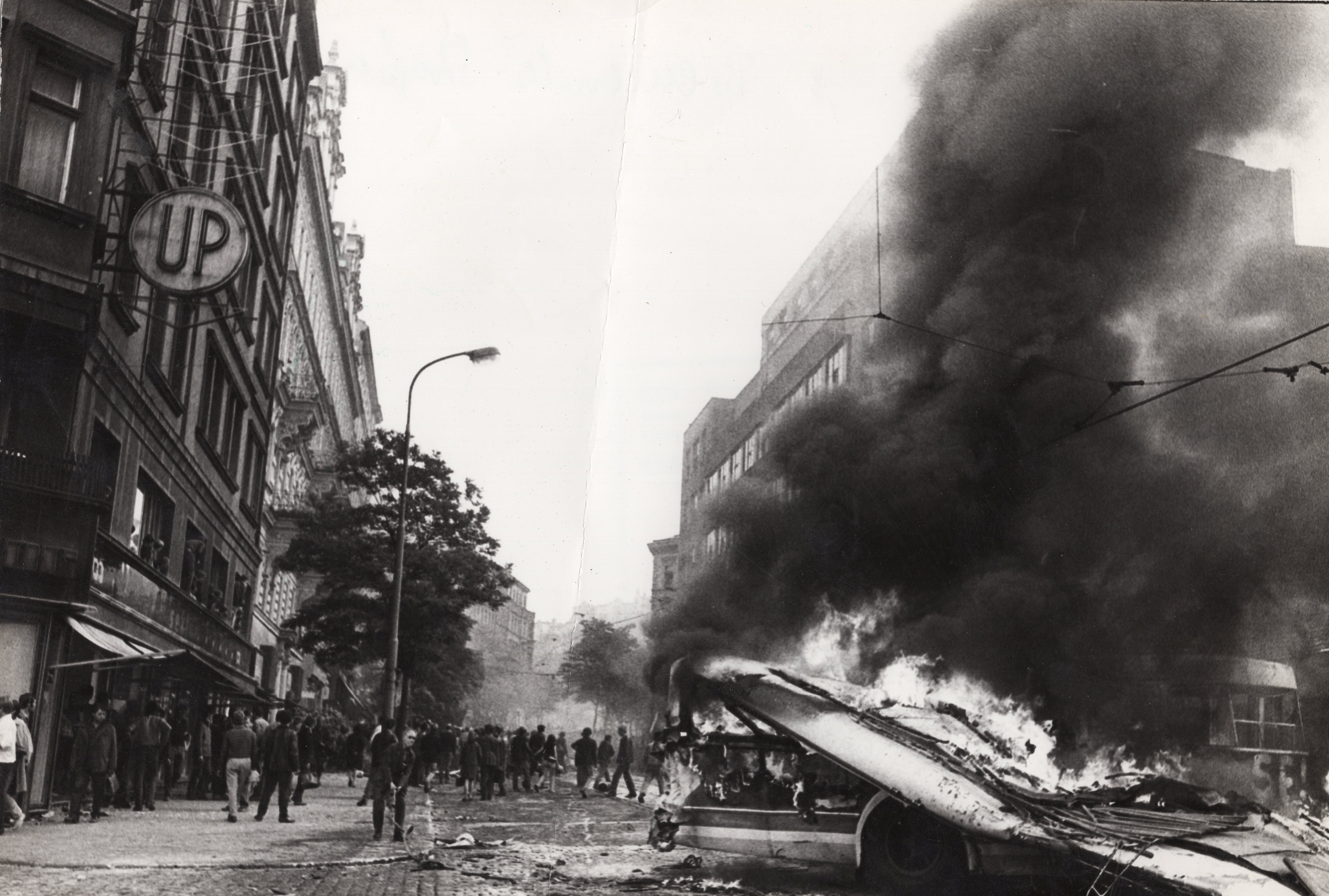 • „Šli jsme se podívat k rozhlasu, co se vůbec děje. A tak jsme byli u toho, ležely tam první oběti. Dva mrtví kluci, kteří byli napůl přikrytí, ve výklenku u rozhlasu. Stálo tam asi sedm ruských aut. Chtěli jsme jít zpátky do auta, jenže zrovna přijížděl tank. Na kraji přejel a rozdrtil autobus. A vpředu na tanku seděl střelec, vidím to jako dnes, byl to nějaký Turkmen. Pak nevím, co mě to napadlo, no skaut, tak jsem říkal: ‚Franto, ten tank na tu vlajku nevjede.‘ Tak jsem po ní skočil k chodníku, koupil jsem to do ruky ze samopalu. Vlajku jsem si dal do podpaží a utíkali jsme se schovat.“