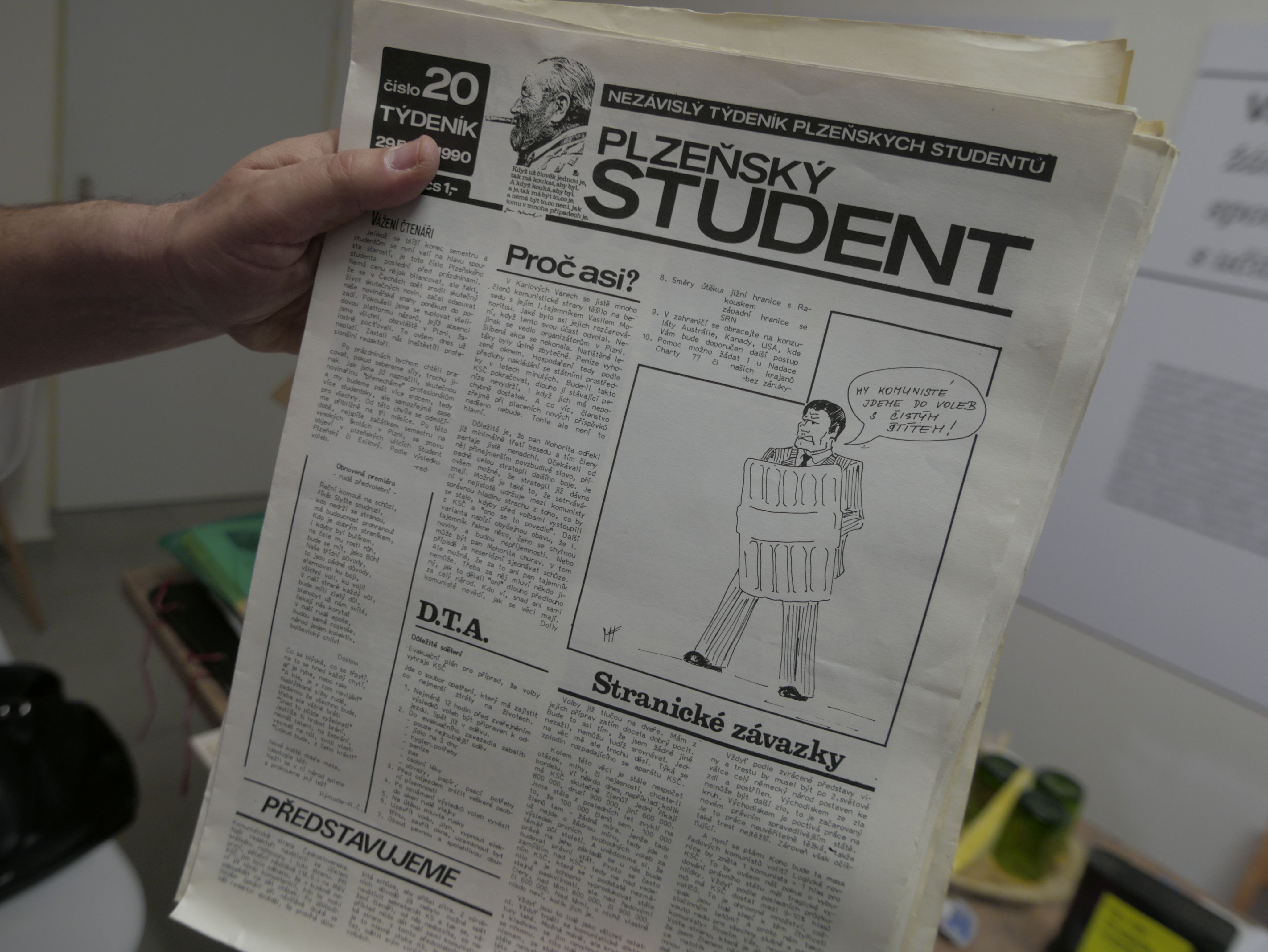 „[U kovolisu] pracoval nějaký Venca Boček, který byl zaměstnanec SSM. A myslím si, že když ti svazáci pochopili, že režimu začíná odzvoňovat, tak se snažili hledat si svoje místečko. Snažili se trošku zalíbit a vlastně pro nás udělali takovou úlitbu. A my jsme měli tedy velkou kliku, že jsme tam jako lékařská fakulta nastoupili. Řekli jsme: ‚Heleďte, prostě nám to musíte dát k dispozici, my to budeme využívat. A Václav Boček, který je tam teď tiskař, tak ten to bude dělat. A hotovo.' A oni: ‚Jo, jo, jo, budeme to dělat.' Václav Boček byl v pohodě, v té době to byl pro nás takový starý chlap, bylo mu třeba pětačtyřicet. Říkal: ‚No, tak jo, budu s vámi spolupracovat.' On měl takový zvláštní životní styl, on tam v podstatě v té tiskárně bydlel. Takže fajn. Nevím, jestli měli v pozadí nějaké plány, že to začnou nějak manipulovat, že to začnou ovládat, že nám budou diktovat, co tam má být vytištěno, aby se jako svazáci zachránili... Myslím si, že tam nějaká takováto kalkulace v pozadí byla, ale my jsme se tím nenechali nějak [rozhodit]. My jsme byli tak sebevědomí a tak sebejistí, že jsme se tím nenechali vůbec ovlivnit. Prostě jsme tam začali každý den vydávat toho Plzeňského studenta. [Takže] takhle vznikl Plzeňský student. A jeli jsme až do třicátého nebo jednatřicátého [prosince], prostě [zhruba] do toho momentu, kdy byl Václav Havel zvolen prezidentem Československé socialistické republiky.“