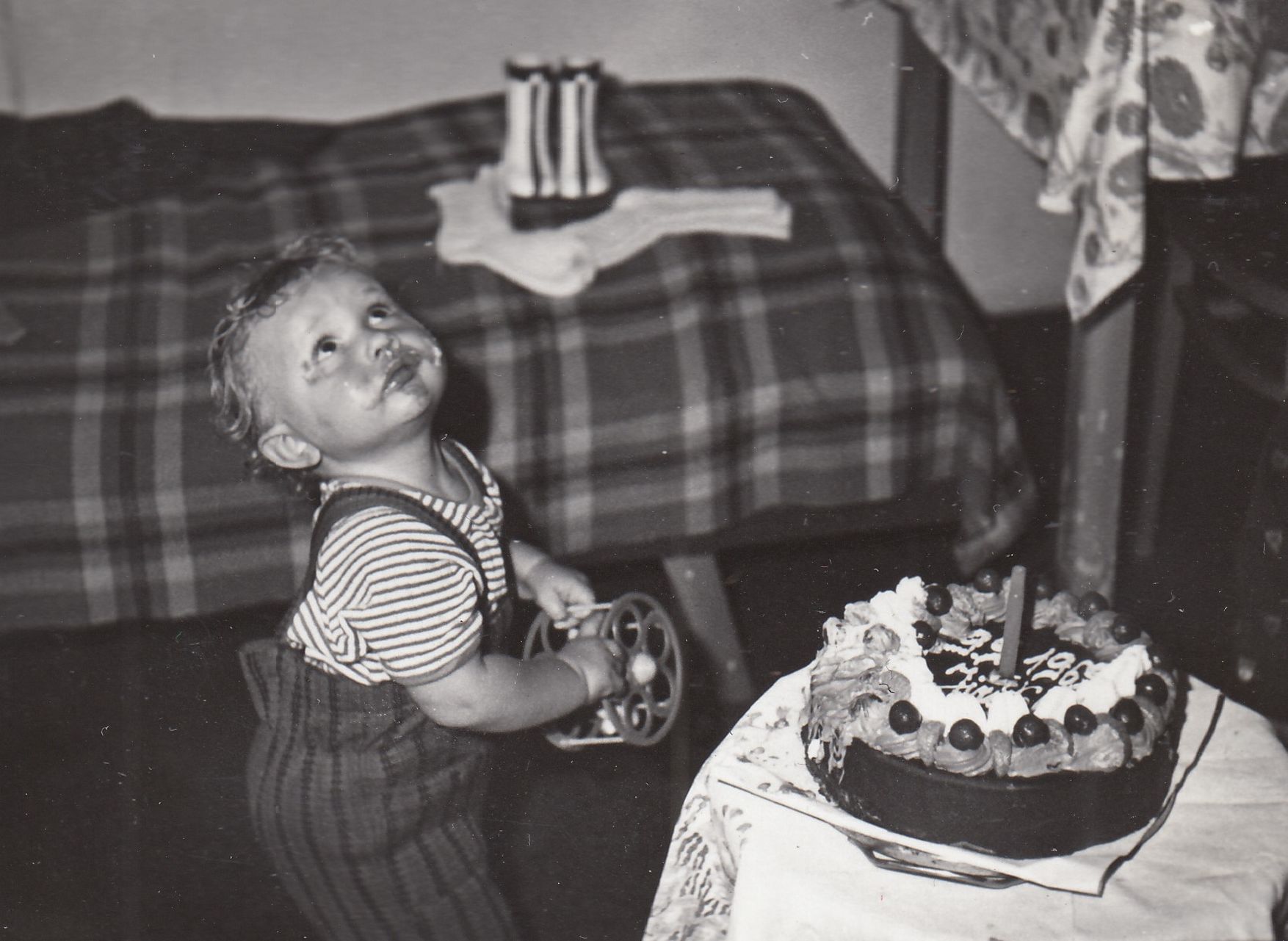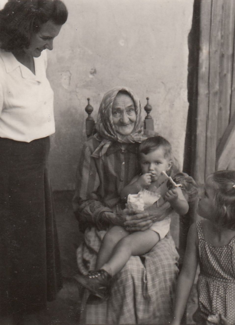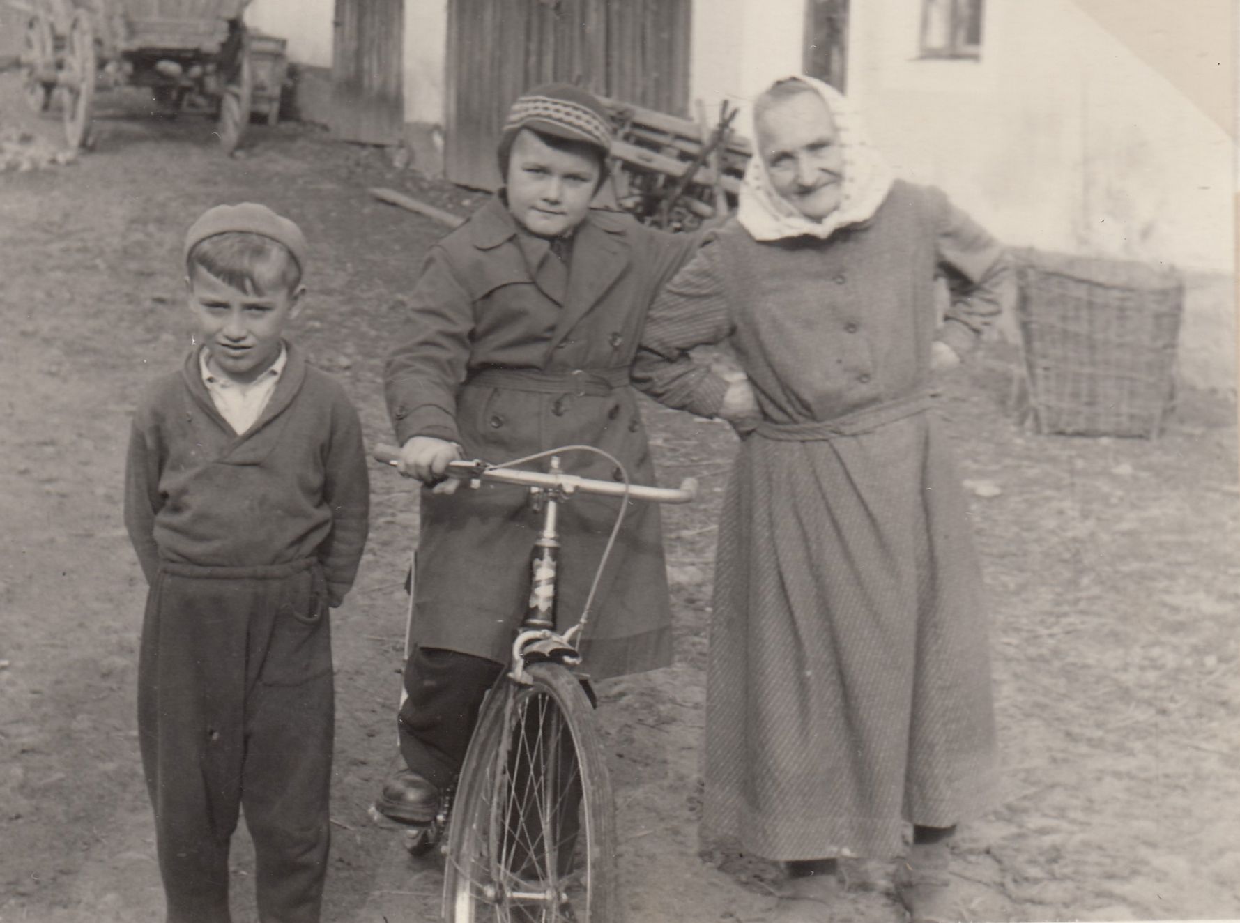 Jiřího prababička (maminka dědečka z matčiny strany) Anna Hodanová na dvoře statku v Malechově nedaleko od Švihova, na kole vedle ní je Jiřího strýc Jiří Hodan, 1959