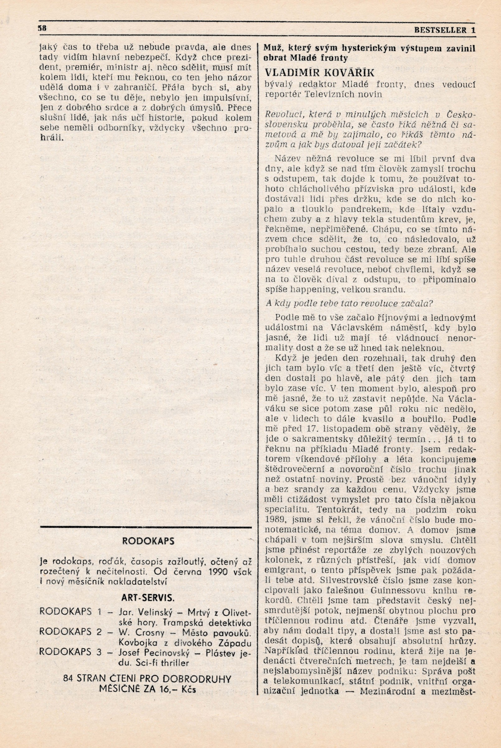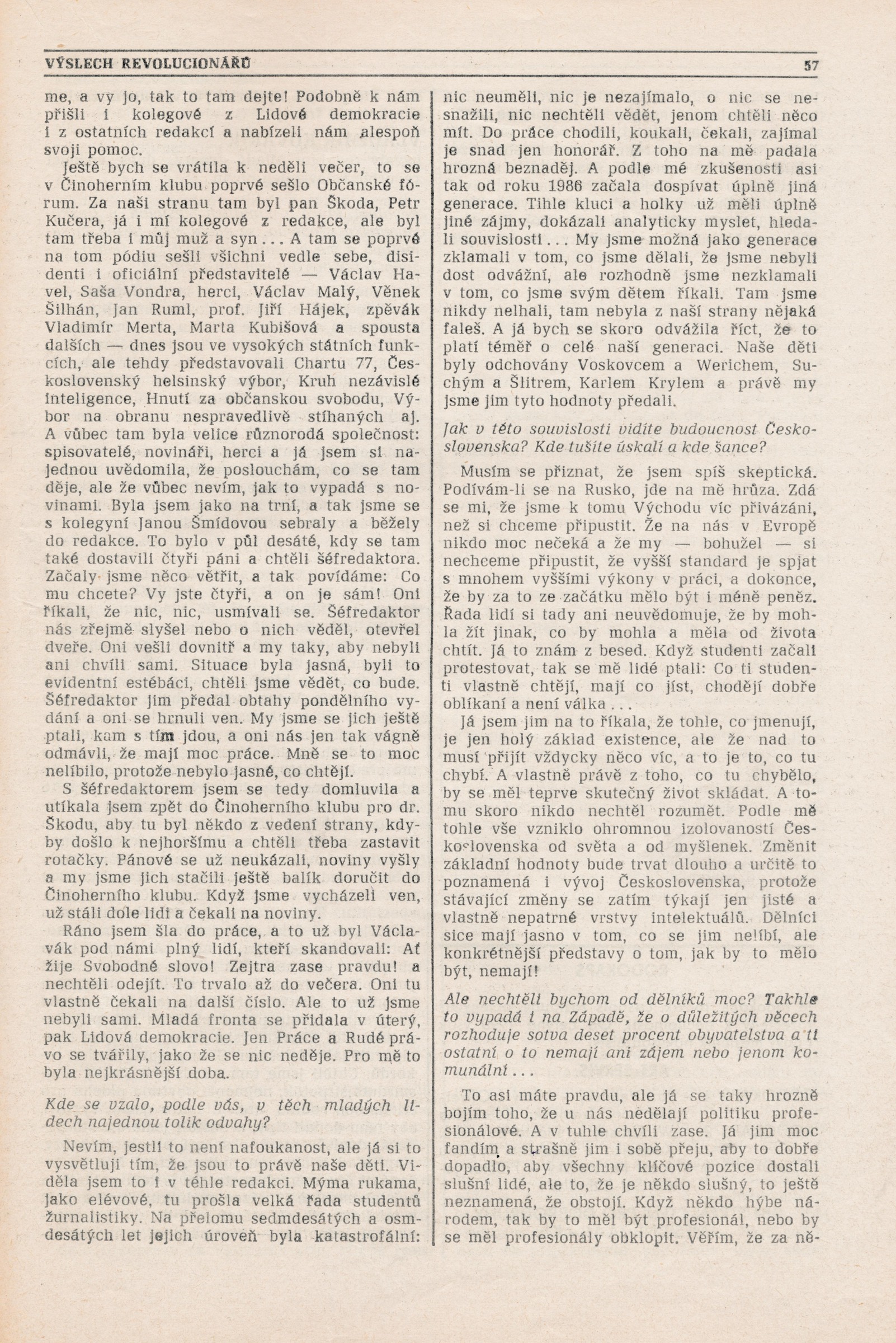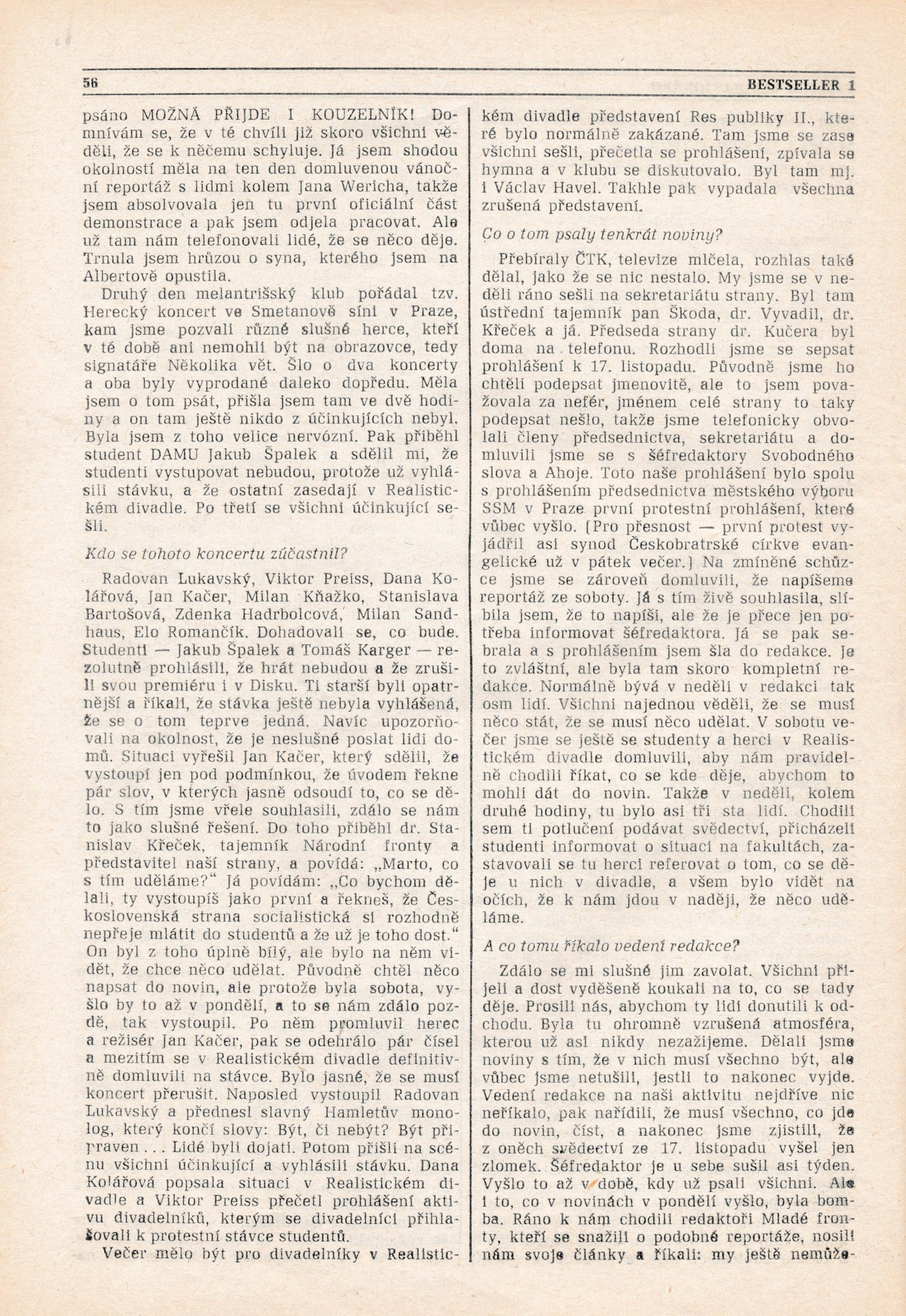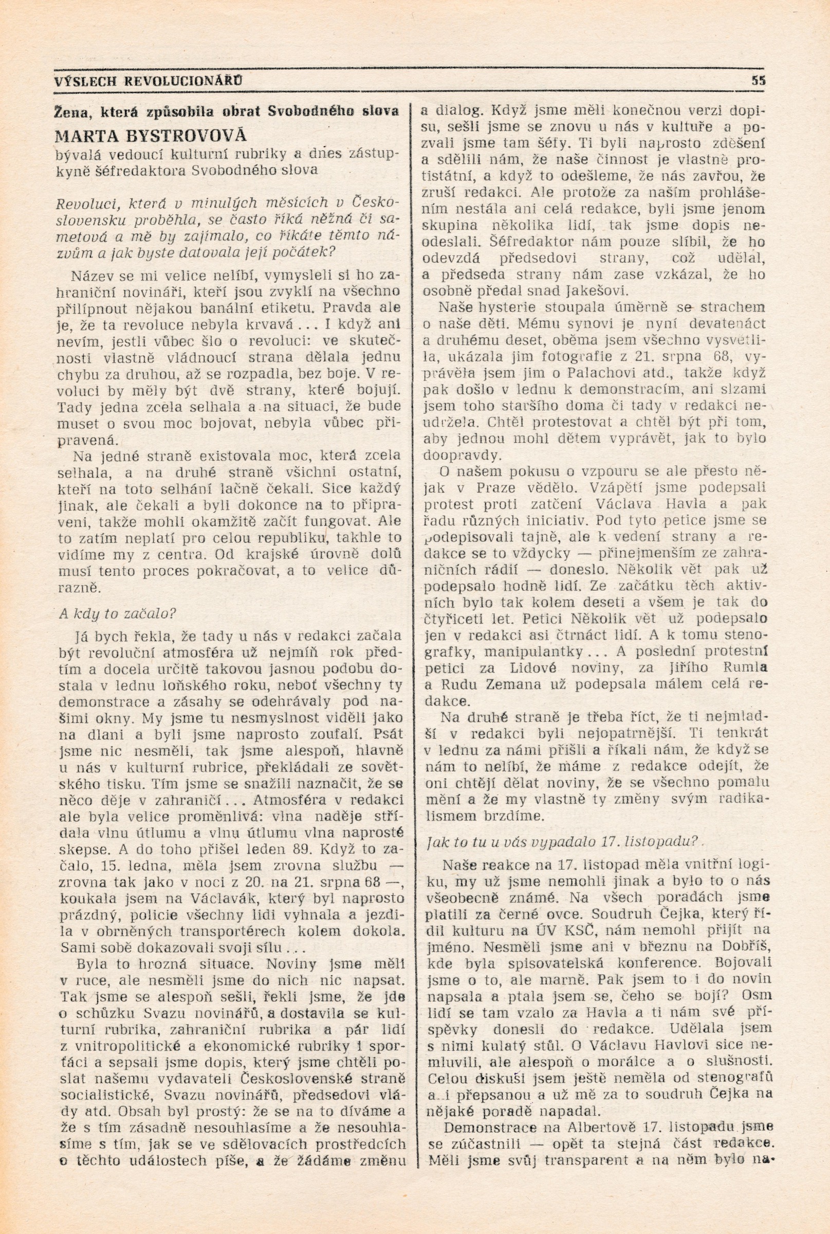 Marta Bystrovová, née Švagrová, was born on 18 December 1947 to Bohumila and Emanuel Švagr. The family soon moved to Prague, where Marta’s father worked as technical support manager at Melantrich, a publishing house. Marta grew up in the streets and suburbs of Smíchov. After graduating from grammar school in 1966 she started as an intern at the daily newspaper Svobodné slovo (Free Word). She was in the hotspot of cultural and political activities in the newspaper’s office on Wenceslas Square for twenty-five years. She mainly wrote in the culture section. In 1968, in the chaotic period when the country was occupied by Warsaw Pact forces, she helped write news reports and distribute special editions of Svobodné slovo. She avoided the political profiling committees in 1970 because she was on maternity leave with her son Ladislav. Her husband Vladimír Bystrov was fired from his job of spokesman for Barrandov Studios. That same year Marta finally decided to abandon her studies of journalism - this was because all the capable and inspiring teachers were forced to leave the school. After maternity leave she returned to her employment at Svobodné slovo. According to her own words, cultural topics and the discovery of new talents became a source of meaningful, joyful, and yet politically harmless journalistic work for Marta within the limitations of normalisation journalism. She signed the petition Several Sentences, and on 17 November 1989 she joined the rest of the editorial staff in protests in Prague-Albertov. She and several colleagues pushed through the decision to publish the news about the brutal suppression of the demonstration on National Avenue together with a statement of disapproval on the title page of the Monday issue of Svobodné slovo, and despite objections from the management, she and the other journalists began providing independent coverage and news reports of the beginnings of the “velvet” coup. The revolutionary enthusiasm made the daily’s print run skyrocket to half a million copies. Marta and her colleagues worked hectically, and their office became one of the focal points of events. In December 1989 she took on the job of deputy editor-in-chief. She worked at the daily until 1991. She was then employed by Lidové noviny (The People’s News; a newspaper with a long-standing tradition - trans.), she accepted an offer to start and create the Saturday supplement. In the years 1995 to 1999 she was engaged by the magazine Týden (The Week). She now writes for the culture section of Lidové noviny.