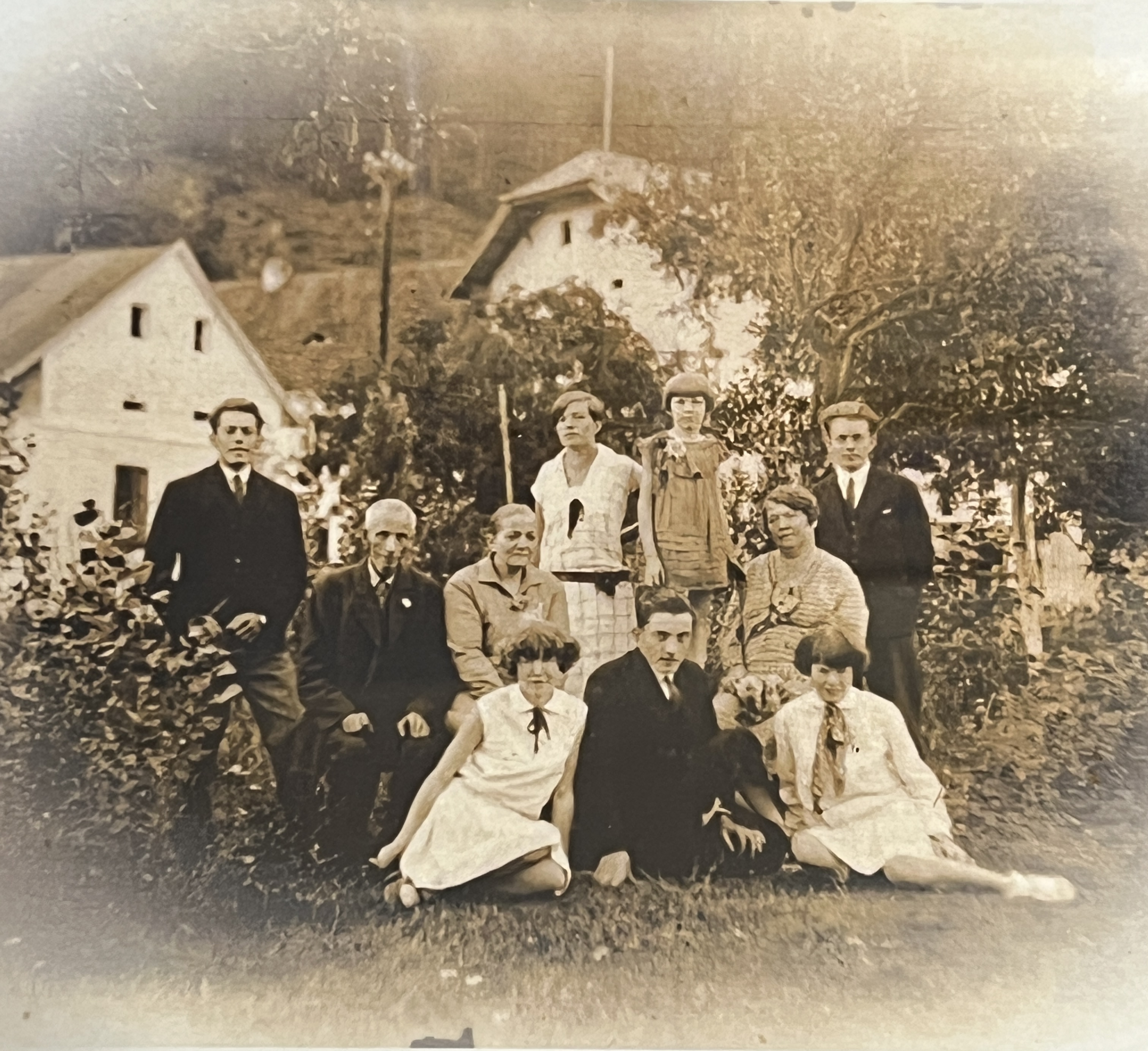 Grandfather Václav's family, left to right: son František, the witness's father, grandfather, and grandmother; middle row: daughter Julie and son Václav; bottom row: son Karel and the daughters of Vojta Beneš the brother of President Edvard Beneš, early 1930s
