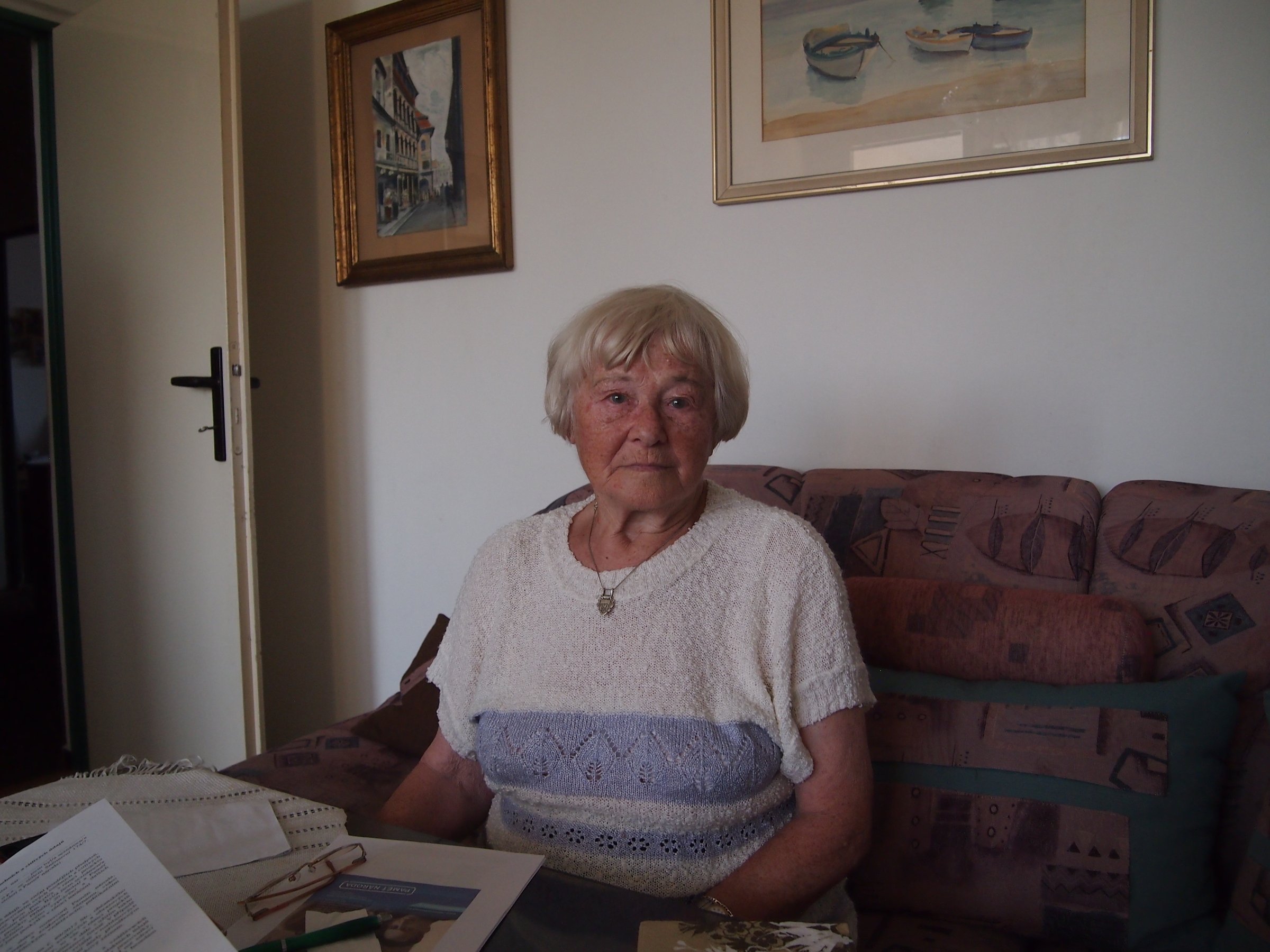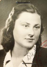 Marta Charvátová, née Dušinská, was born on 2 April 1926 in Trnava, Czechoslovakia (now Slovakia). She grew up in Bohunice, where he father managed a distillery. After the declaration of the Slovak State, she was discriminated against because of her Jewish origin. She was expelled from her school in Trnava and banned from studying. The family tried unsuccessfully to emigrate to South America or escape to Hungary. Then the Dušinskýs moved to Nové Město nad Váhom. In autumn 1944 the whole family hid in a forest bunker near the village of Kálnice, where they hid for two months to avoid persecution. However, they were found by the Germans in November 1944; they were captured and imprisoned in the concentration camp in Sereď. In December Marta and her mother boarded a transport to the Ravensbrück concentration camp. They were also held in the Bavarian concentration camps of Burgau and Türkheim. Marta lost thirteen of her close relatives during the war, including her brother Osvald, who died during a death march from Sachsenhausen. In 1949 she married the full-time soldier Jaroslav Charvát, who had been in the anti-Fascist resistance during the war and had been interned in German prisons. Marta Charvátová followed her husband when he was transferred, moving first to Kolín, then to Pilsen, where the witness lives as of 2017. In 1951 she gave birth to their son, and she devoted ten years to caring for their child and keeping their house. After that she worked as a shop assistant and manager at a health and beauty store until her retirement.