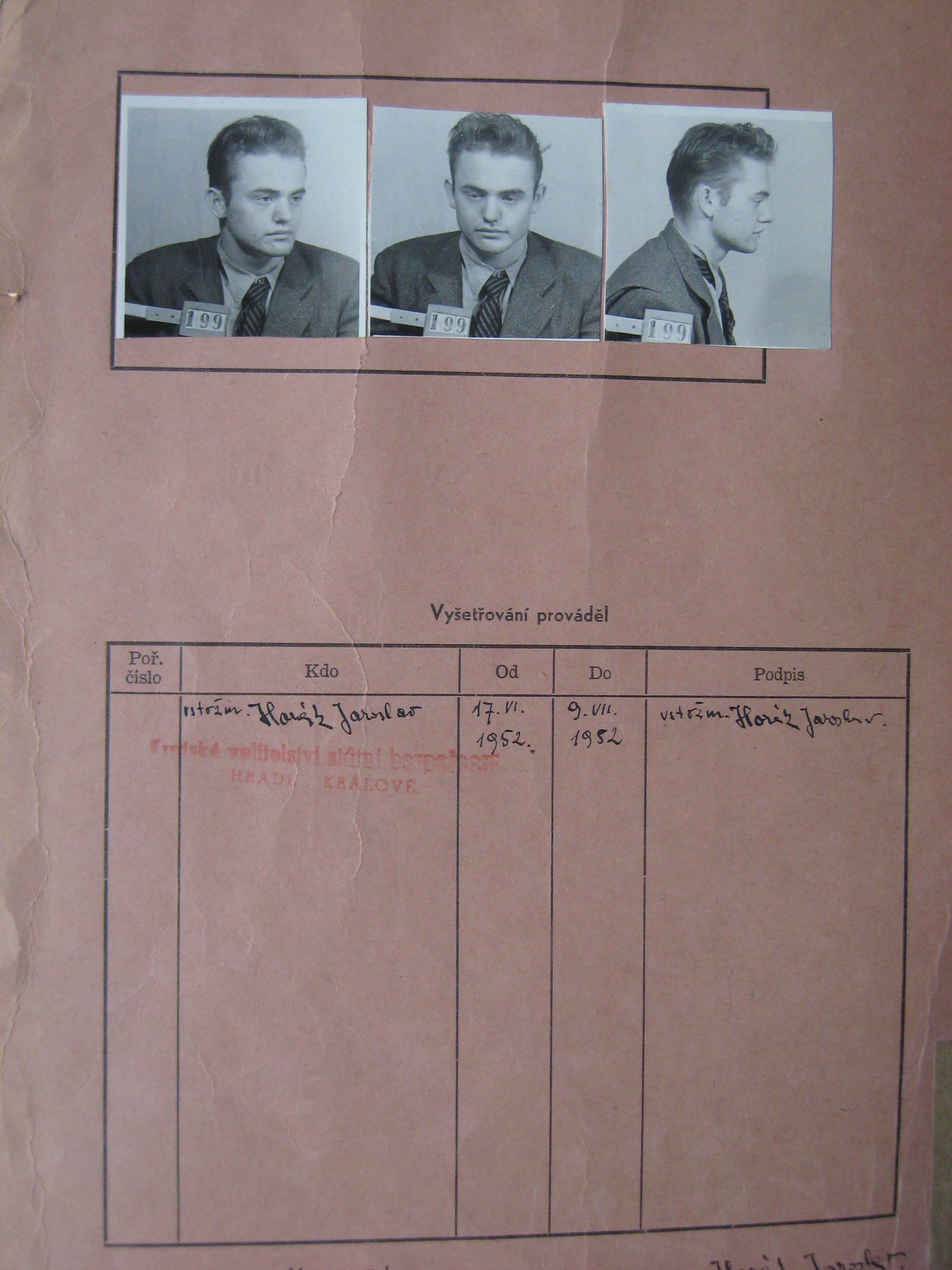 “Where did you get the mimeograph machine and the copying machine, and who was with you? My head was rattling as I was thinking what to tell him. The most important thing for him was that he made me confess right away. That was enough for them. They wanted to know other names, they were telling me the names of all my friends, even of those who were not involved in the group, and thus I could see that they were only giving it a try. He said: ´You will tell the truth, because all of you are detained here, and we can tell immediately when you say a lie. That’s why your eyes are covered so that you don’t see them.´ What occupied my mind most, and I can say it in all honesty, was that I have not given them a single name out of these fifteen boys. They were mistaken, they had been following me for one year, but they weren’t able to prove me of doing anything when I was no longer a minor. They didn’t find any firearms, nor the pamphlets, but I admitted to those. ´Where did you put them, and where did you hide the mimeograph machine?´ I replied: ´I burnt the wooden parts, and I threw away the rest. But the other boy actually had the machine at home. There was a pub in the railway station here, and this boy’s father rented this pub, and their flat, where we printed the pamphlets, was on the first floor. By the way, general Klapálek was also born there, his memorial plaque is there on the house.”