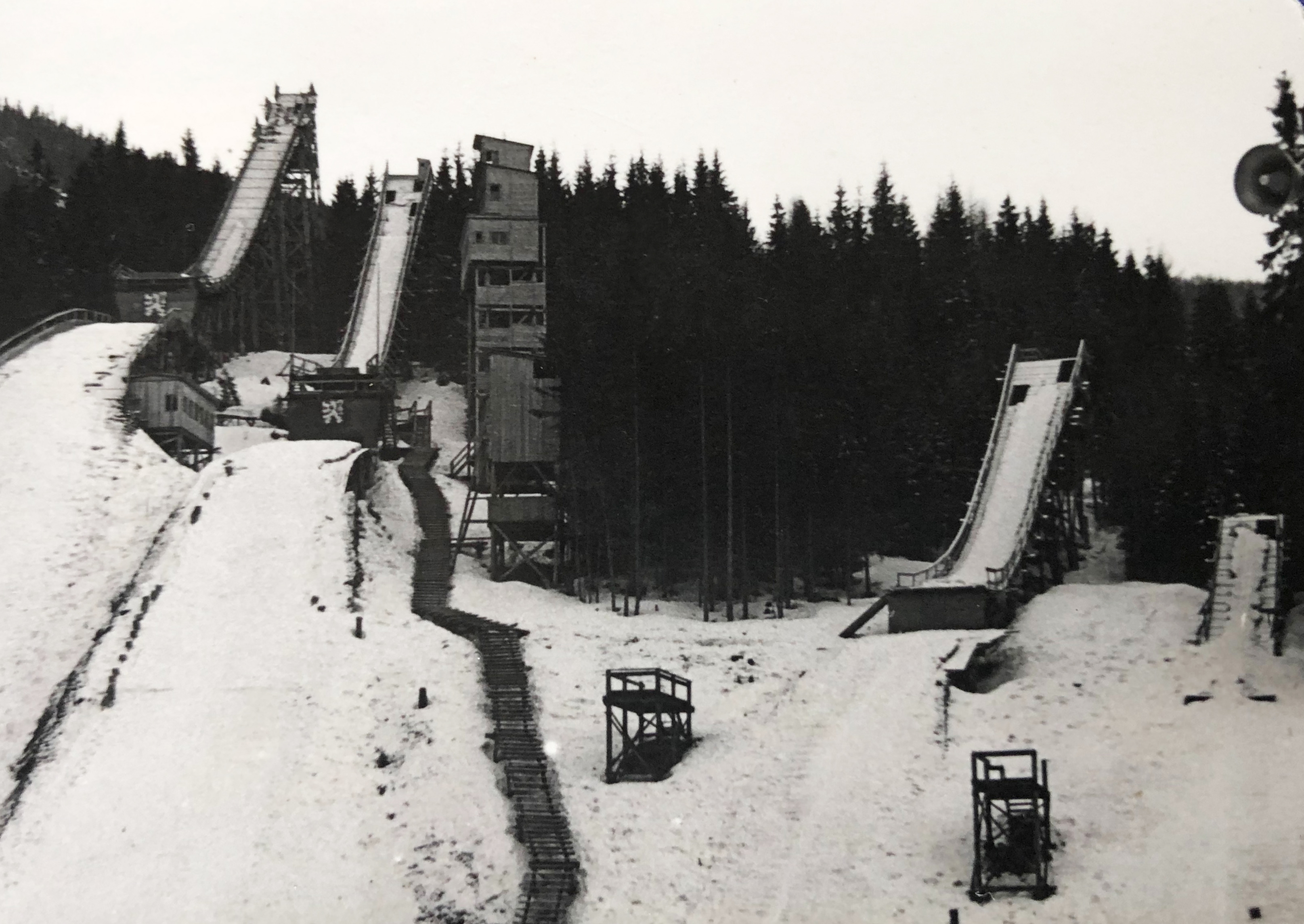 Common photo of jumpers from competitions in Rokytnice nad Jizerou - No. 31 Fanda Hnyk, No. 35 Kurt Gernert, No. 33 Šalda from Vysoké, No. 30 jumper from Jablonec nad Jizerou, 50s