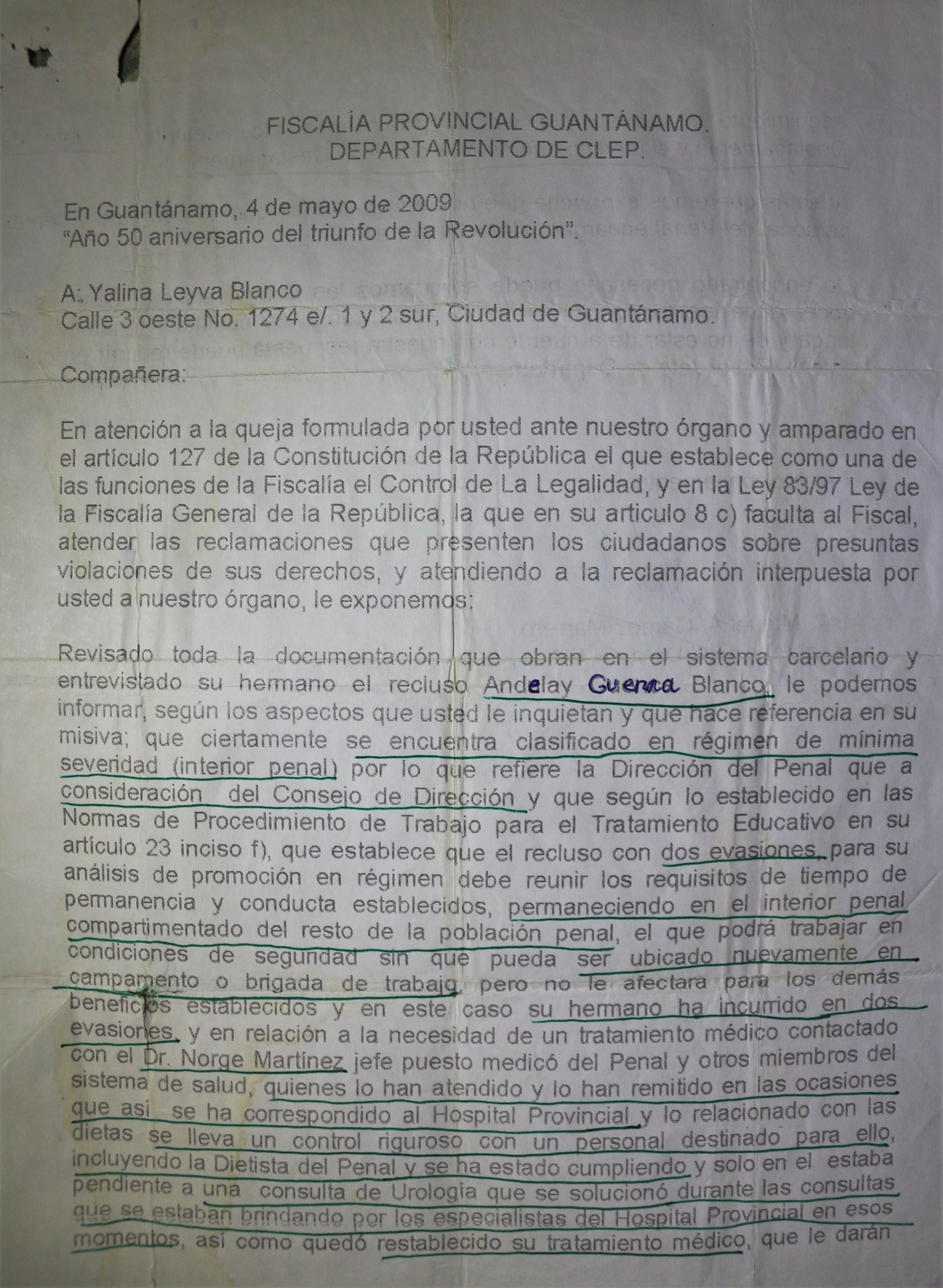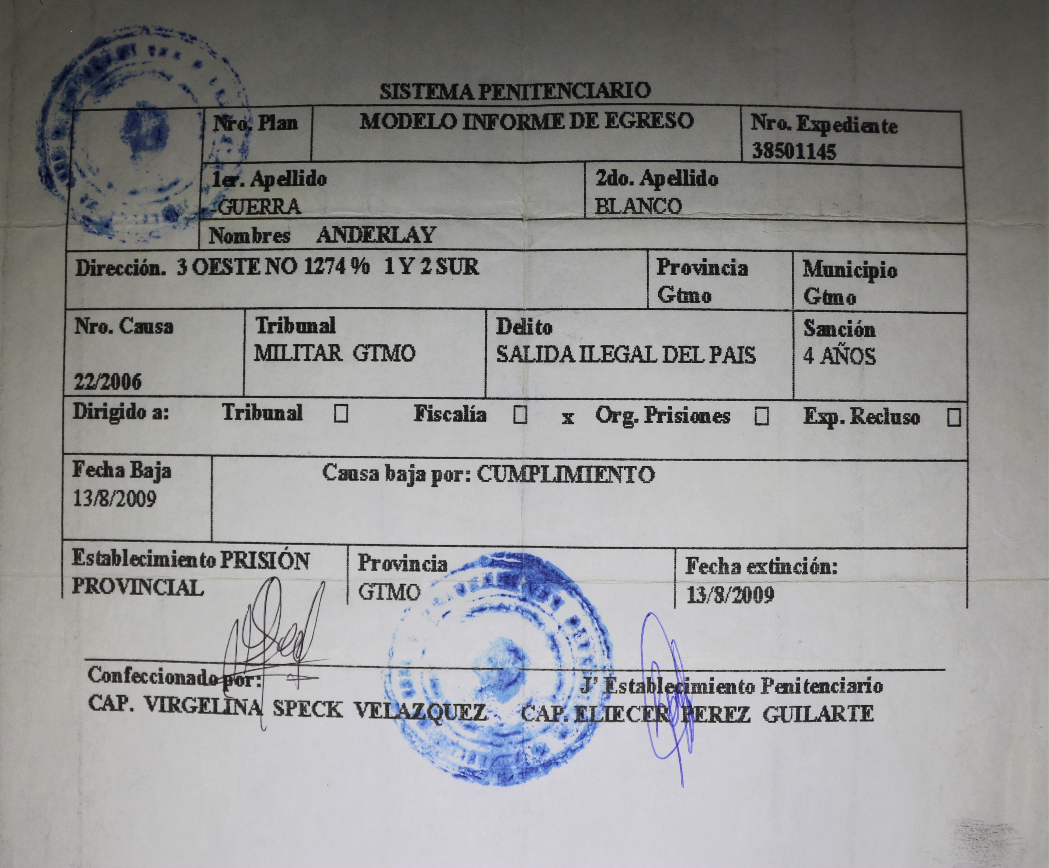 “A colonel from the Ministry of the Interior and several officers of the Armed Forces went there that day [to the Guantanamo Naval Base to where Anderlay escaped in October 2005 but from where he was going to be returned to the Cuban authorities according to the 1994 immigration agreement] to receive people. That day, we were handed over three people - two from the city of Guantanamo and one from Havana. They arrived there in a little bus that was used for tourists, they read the immigration agreements, they started their conversation, and in a couple of minutes we were already in the Cuban part and going in the transport. Several kilometers later, between three and four kilometers after leaving that area, out of sight of the US military officers, the transportation stopped and they ordered us to go out. They burned the clothes we owned at that time, they burned them there in a pile they had made there. The documents they gave us at the base, and which they said could not be taken from us, they took them away. And they put us in a patrol car, in such a car-cage, which took us directly from there to the Provincial Operations Unit, located north of the city of Guantánamo, a center that did not have, or does not have the conditions to keep a detainee in custody, or any prisoner in Cuba. There we were informed, as I didn’t get to know anything about the others since they separated us coming from the Base… thus they told me that from that moment I was being accused of illegally leaving the country. Which means that there occurred a total violation of the immigration agreements of 1994.”