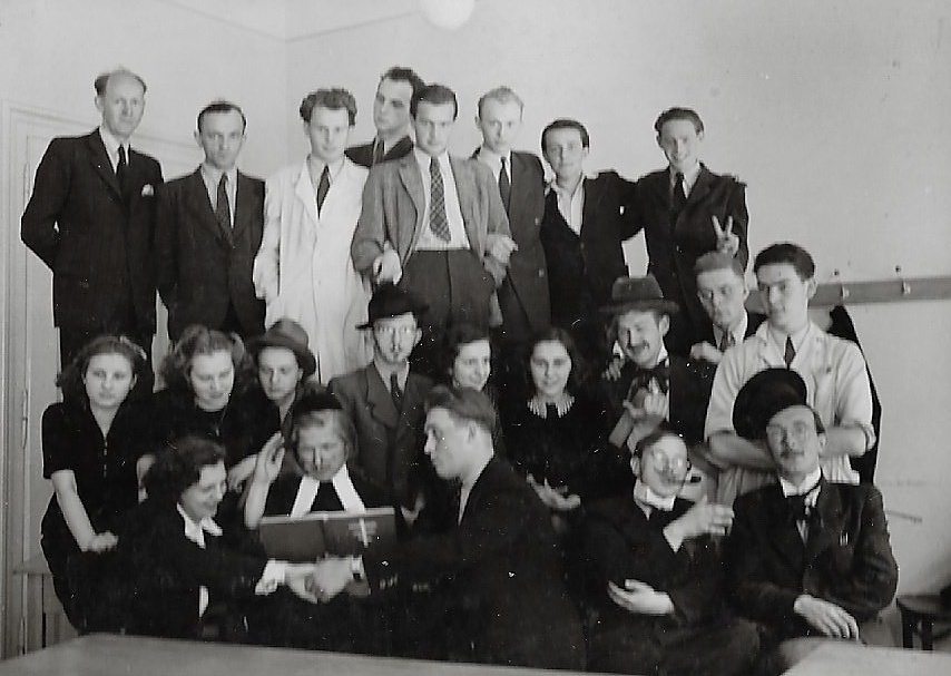 Conversion course for technical draftsmen (VUT Prague - Karlovo nam, 1943) - Pavel Holecek at the top right with his fingers to V. Head under his fingers was also a member of the Intelligence Brigade Vaclav Strnad, about which Pavel Holecek learned about it after the war.