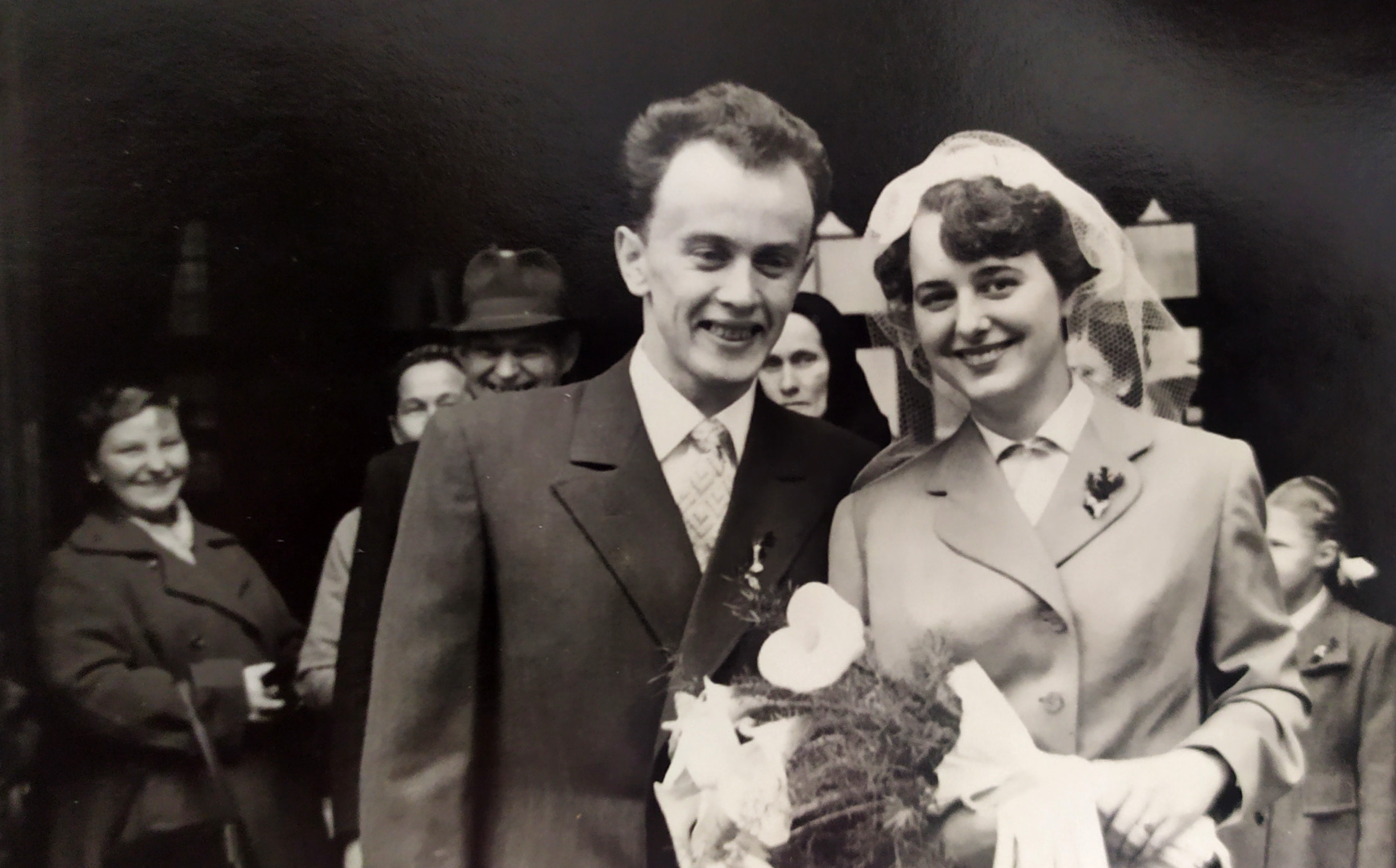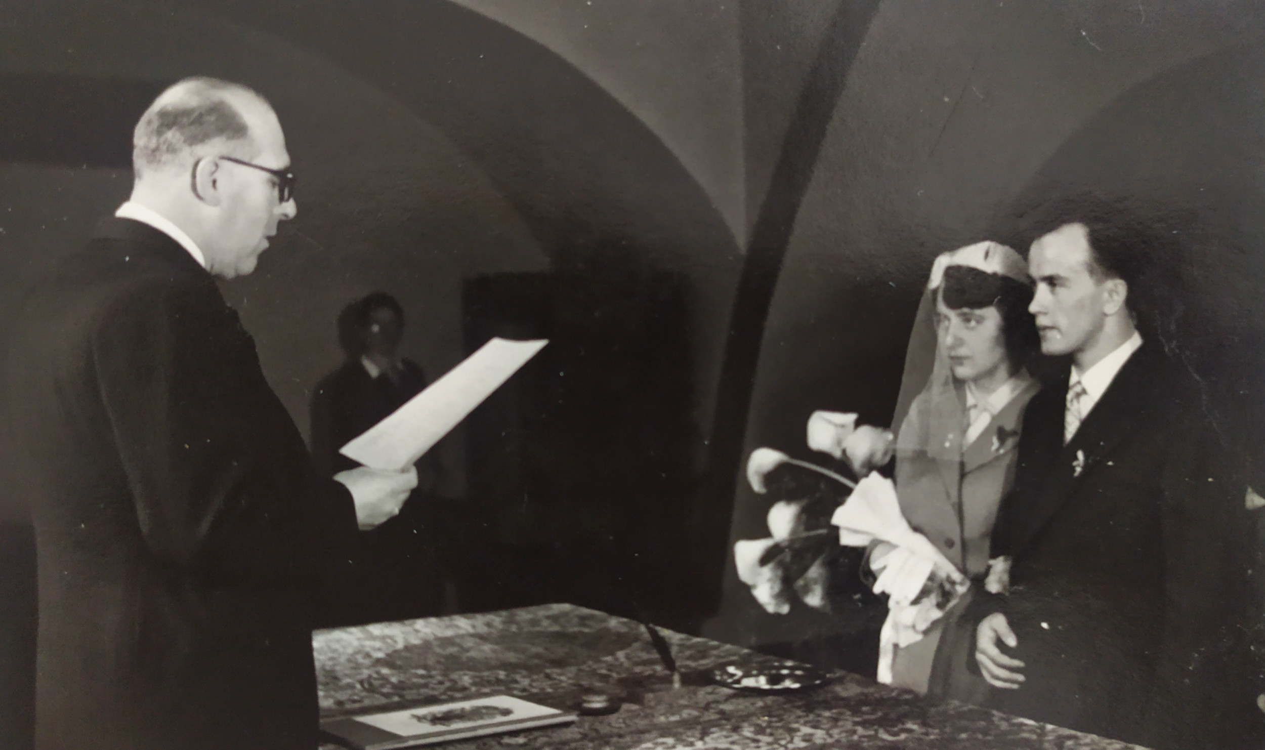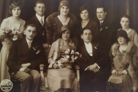 The wedding of the stepson of Aunt Hrabětová (top row, centre, sister of the deceased mum of the witness), far left, top row: Blažena Huláková (witness' mum's sister from the first marriage of her father, Jaroslav Valášek), far left, bottom row, Josefa Bautzová (witness' mum's other sister from the first marriage of her father, Jaroslav Valášek), above her, witness' mum, Jaroslava Kýrová, née Valášková