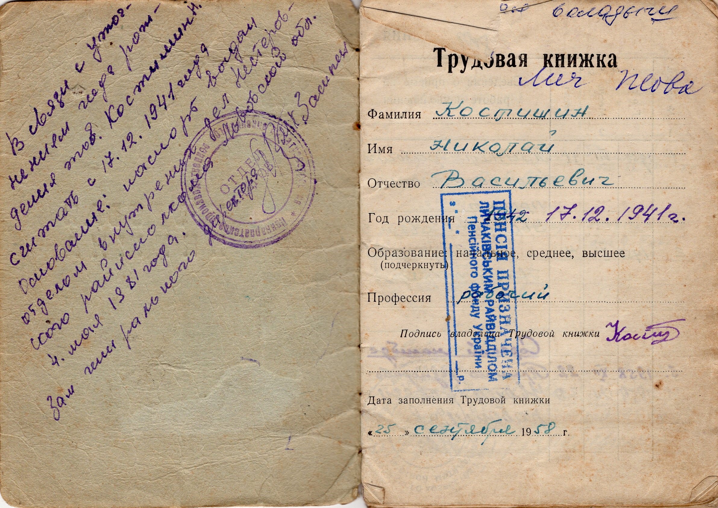 Mykola Kostyshyn's employment record book with a record of his first job. Thanks to a chance meeting, the respondent received a job and employment record book, which helped him after returning to Ukraine.