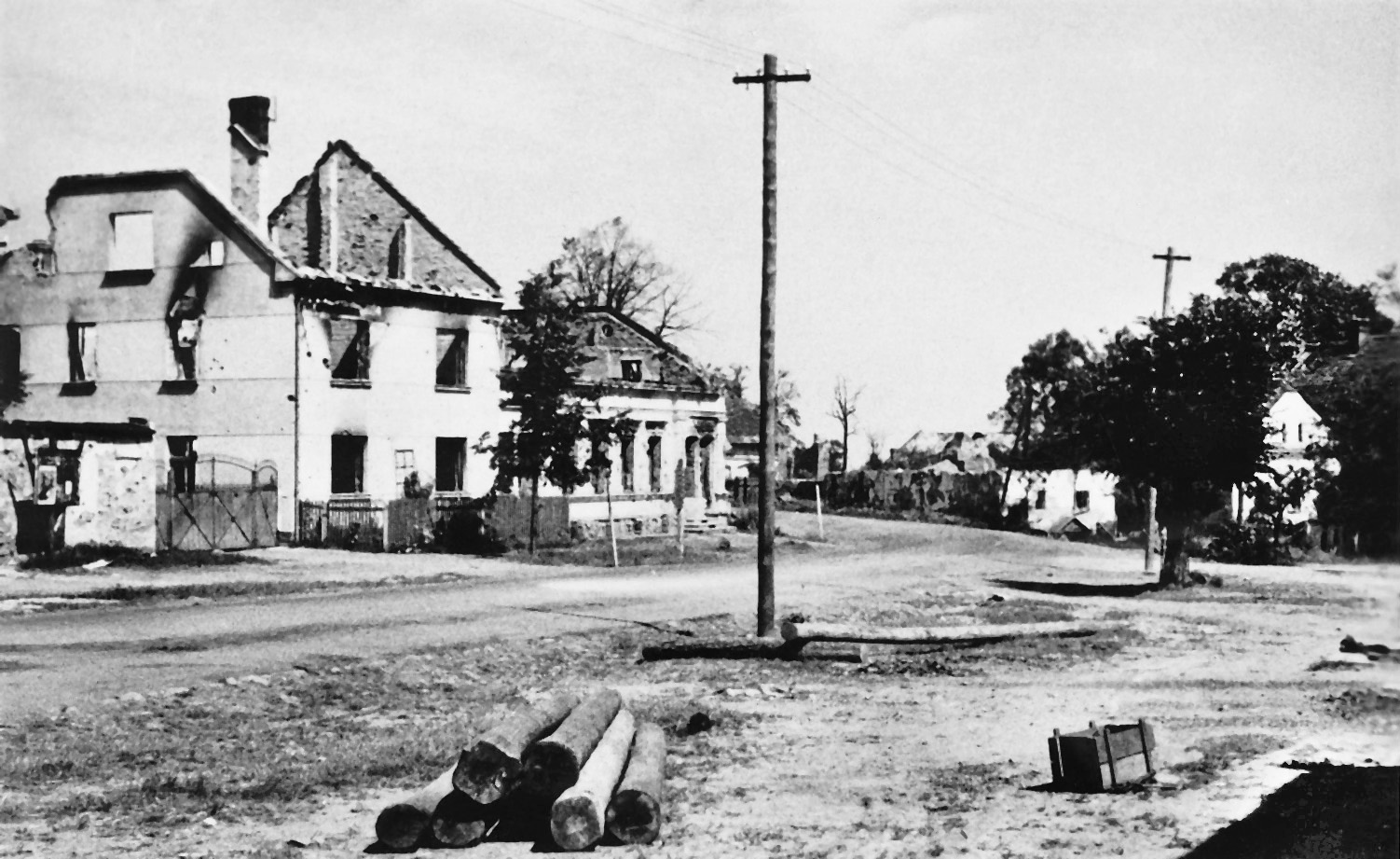 Crossroads of the roads to Opava, Ostrava and Háj, on the left burnt houses of Onderka and Weiss, 1945