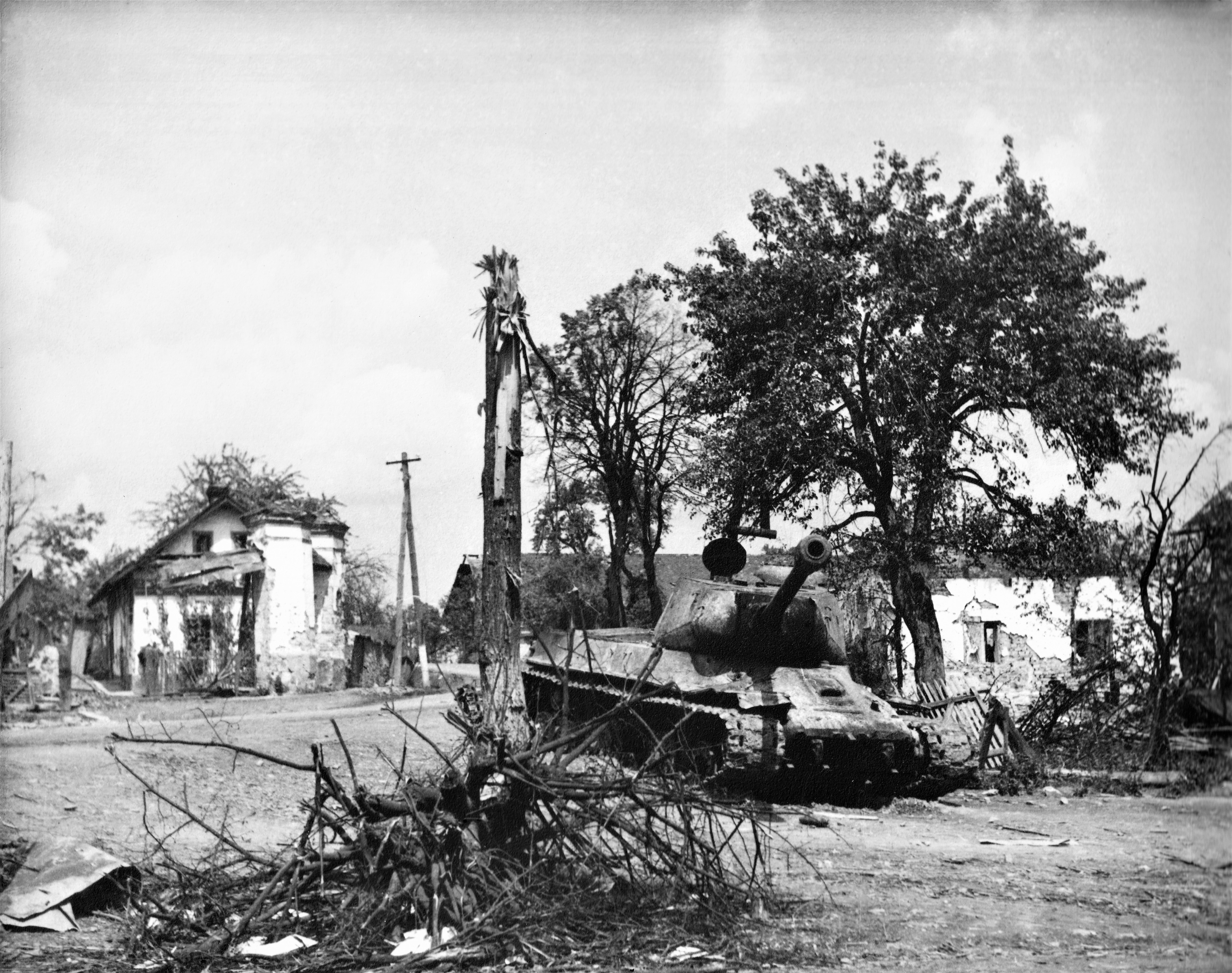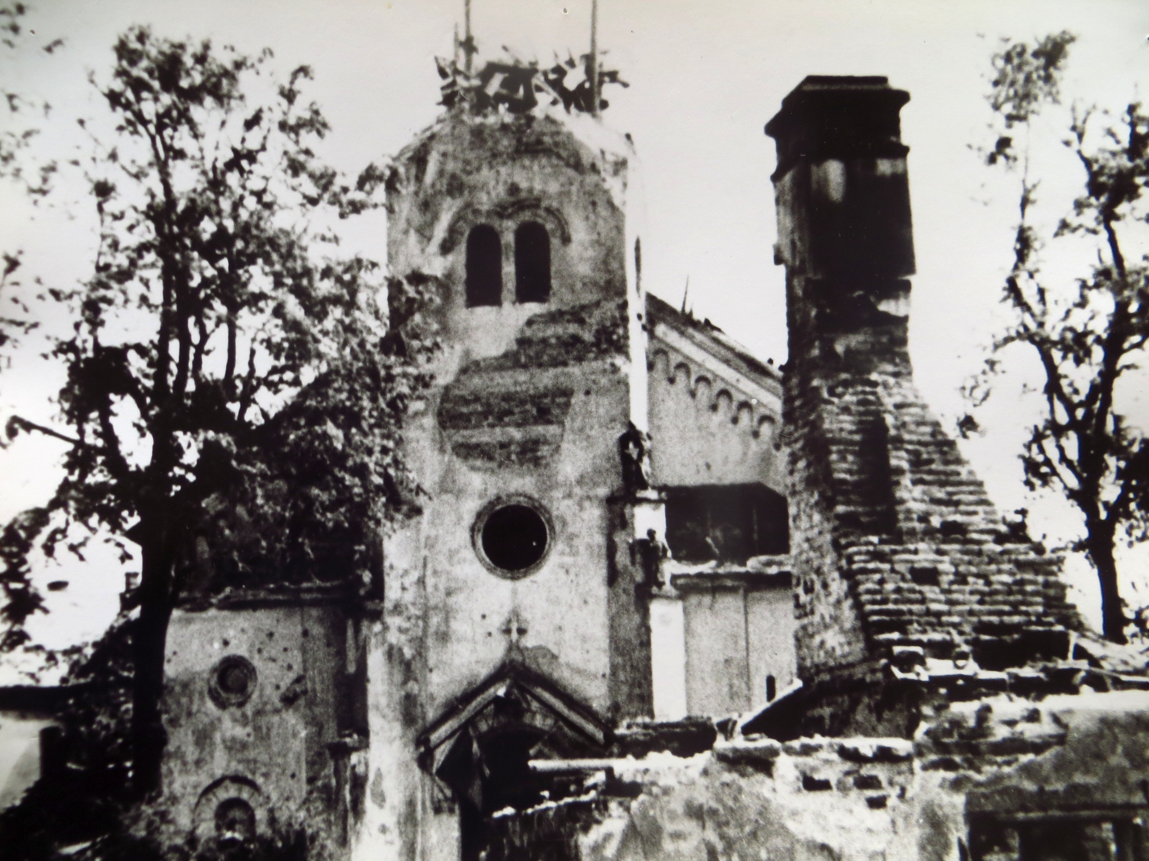 Destroyed church in Hrabyně, 1945