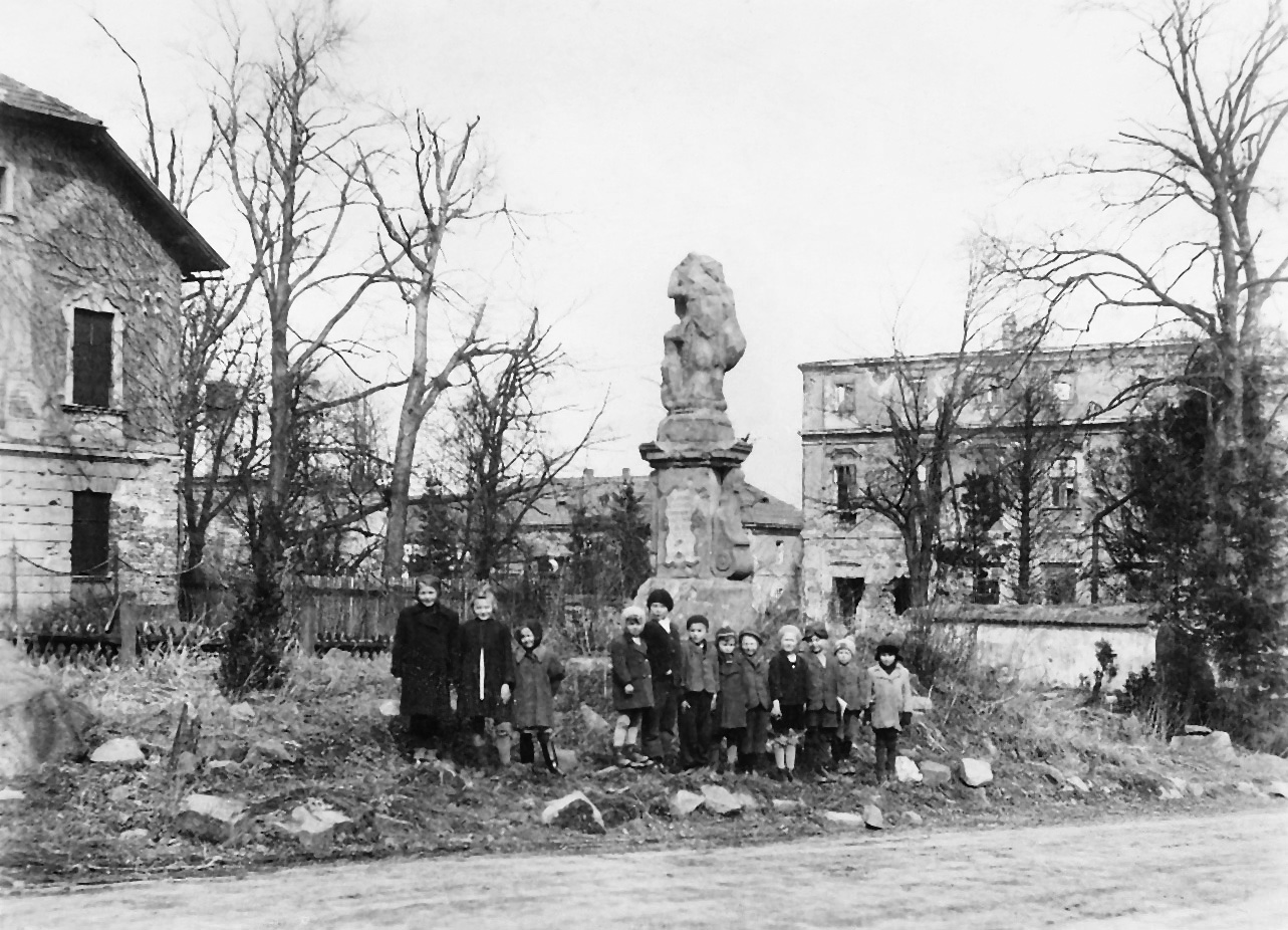 On the left the parish of Hrabyně, on the right the torso of the castle and in the middle the destroyed statue of St. Anne, 1945