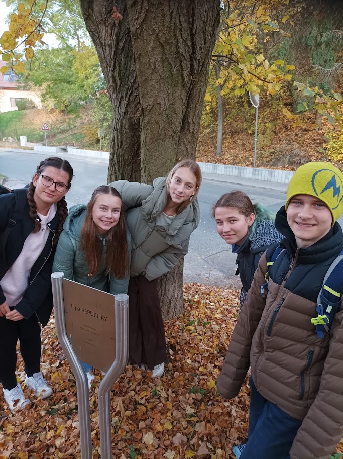 Pupils' team in front of the linden tree planted by Jiřina Kudličková's grandfather