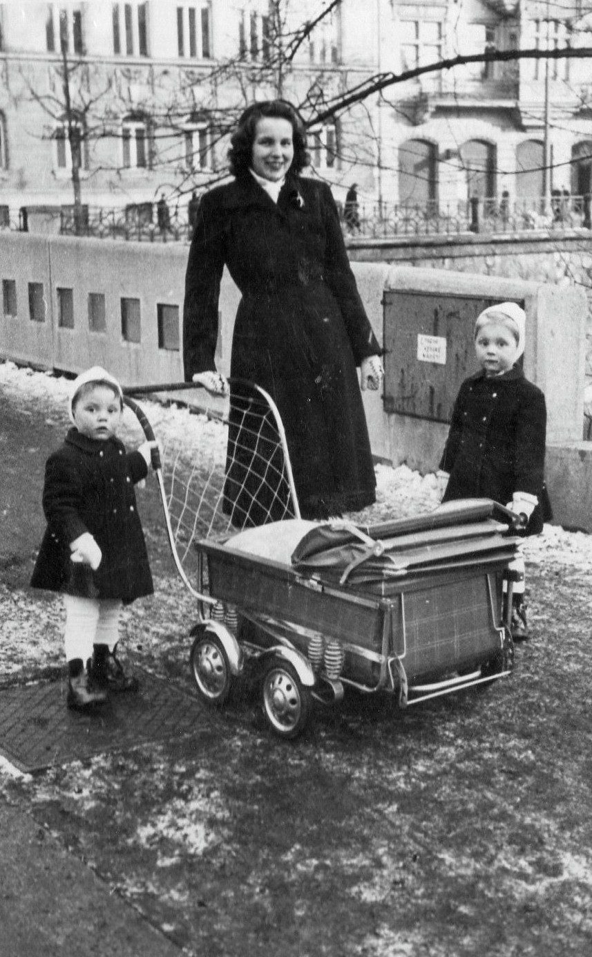 Mother Eleonora, Countess Bubna-Litic, with witness's sisters Markéta (right) and Monica (left) and Petr Dujka in the pram, 1951