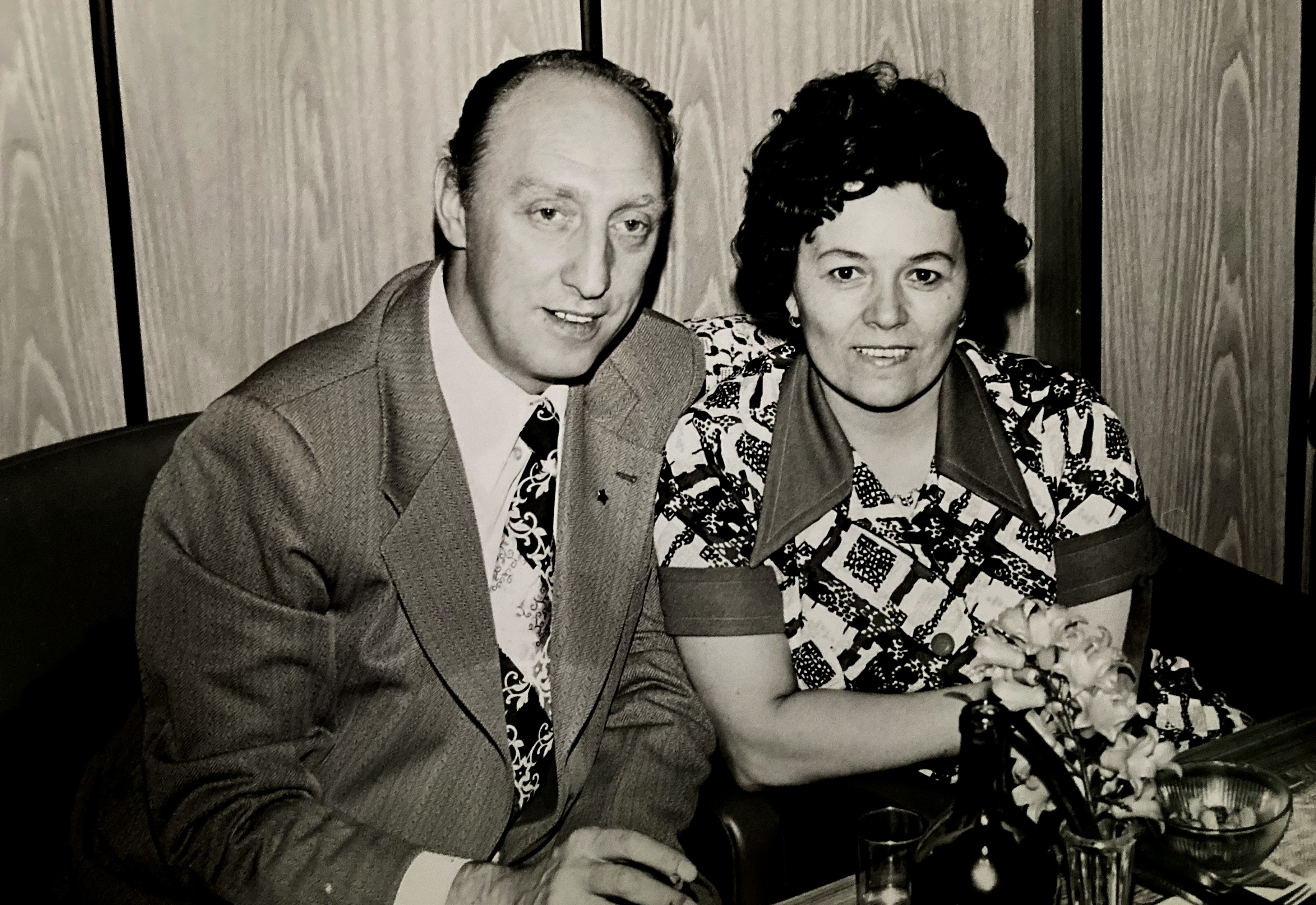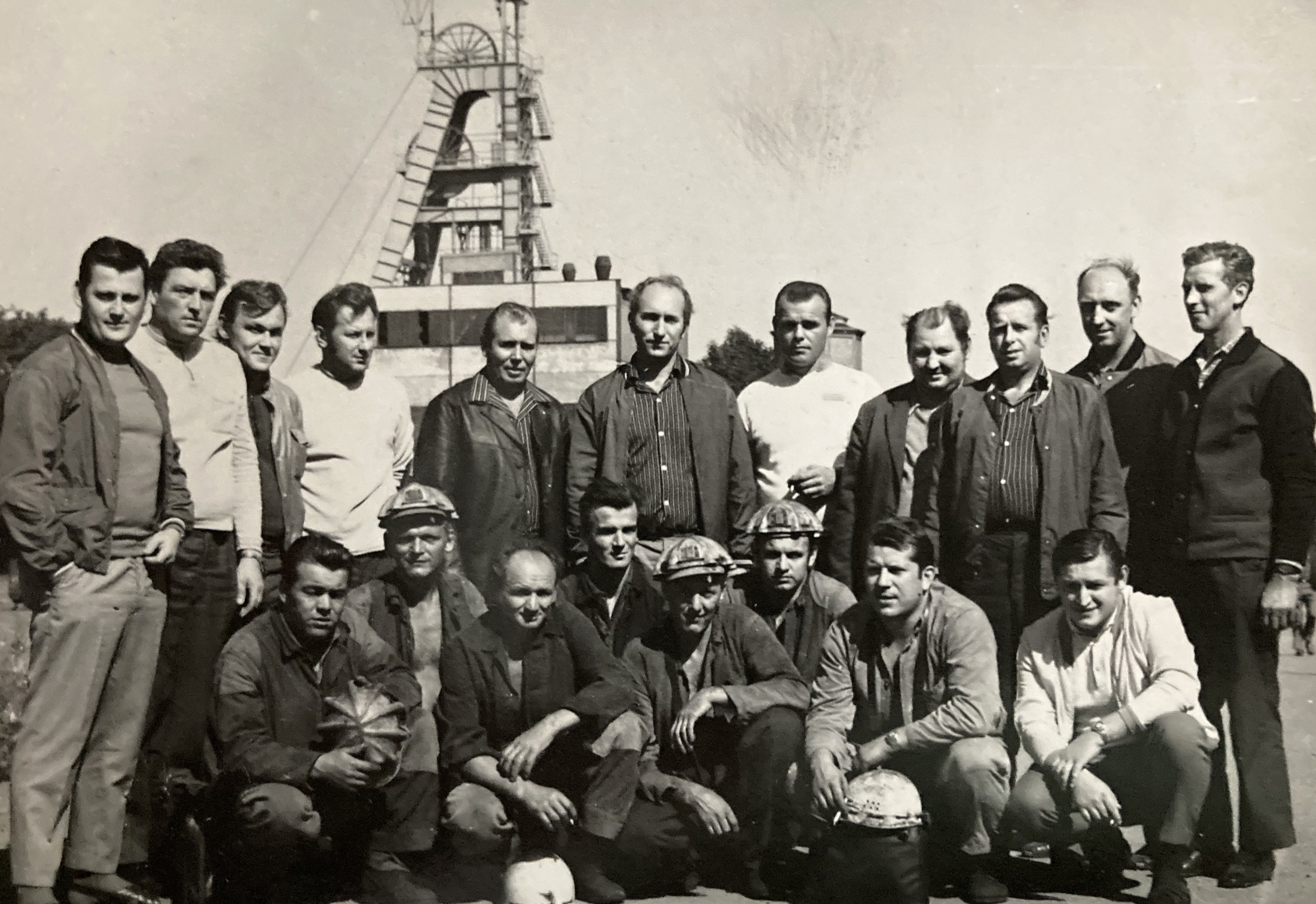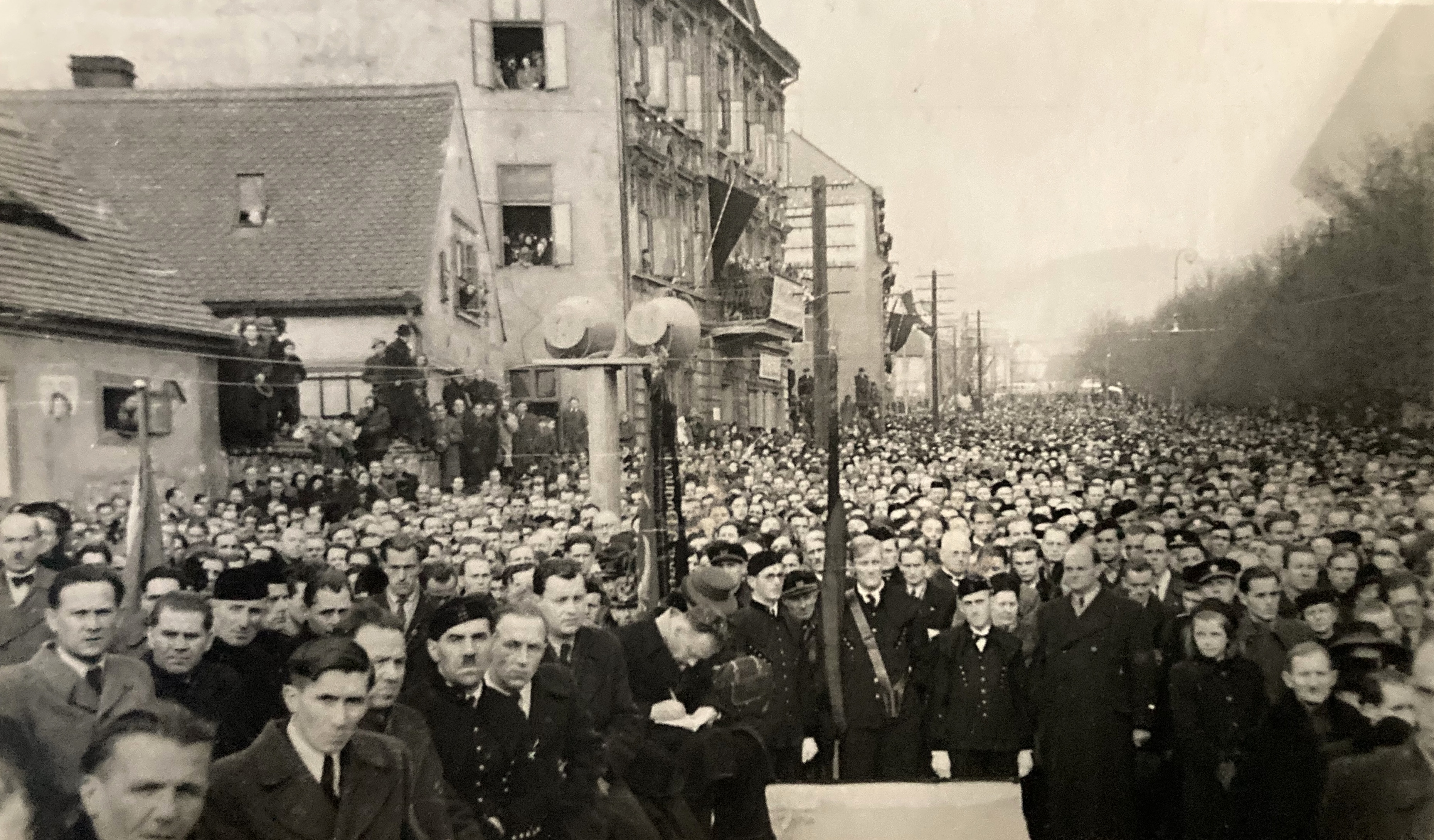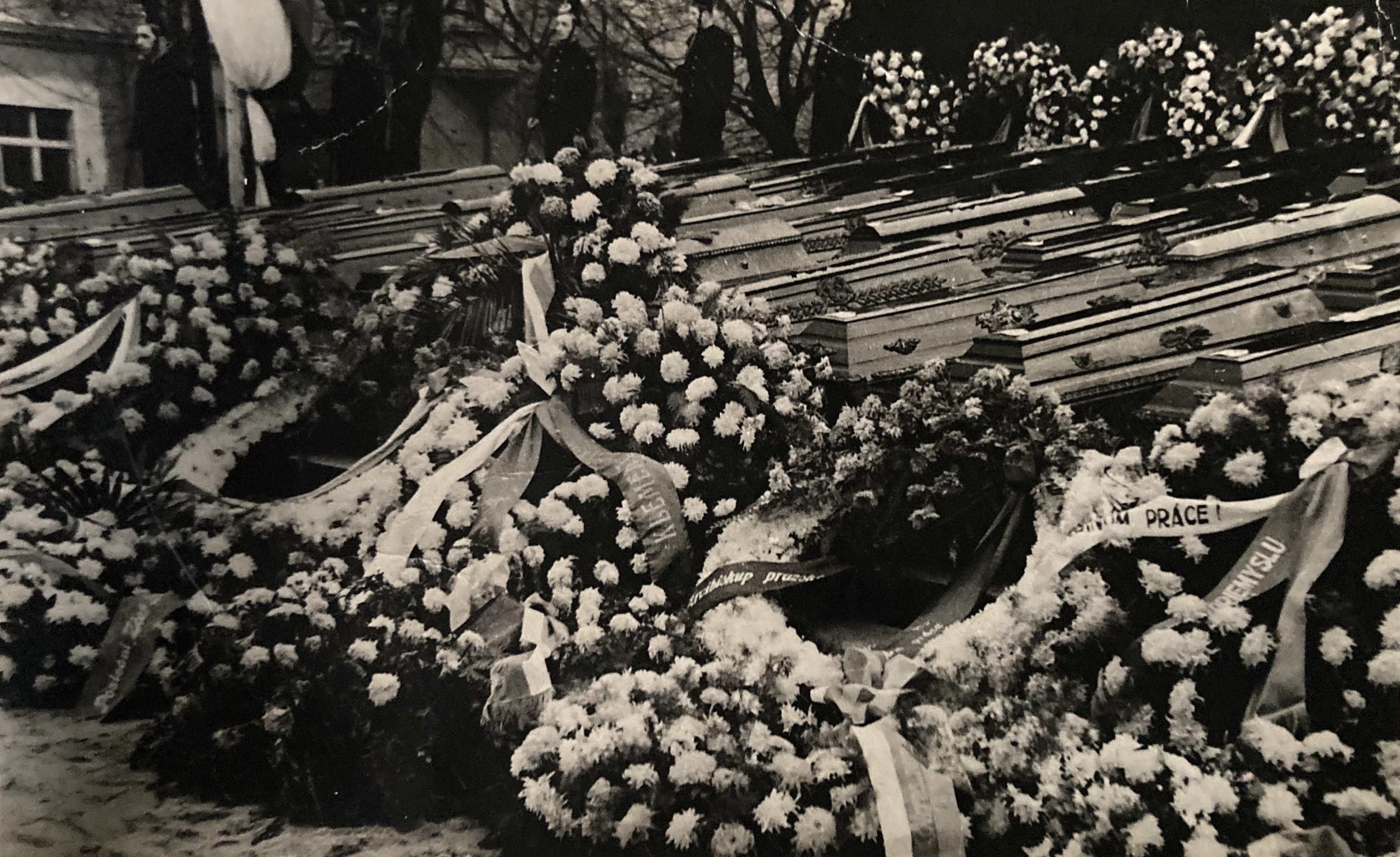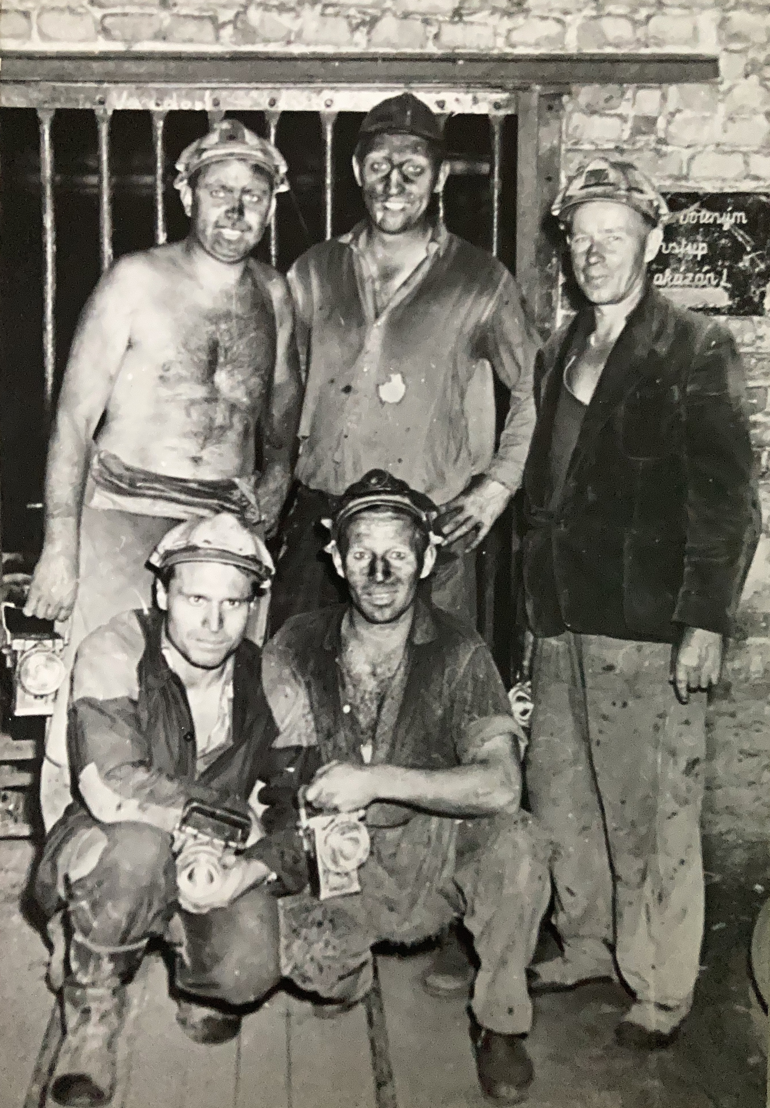 From the celebration of Prof. Libenský's sixtieth birthday - Ilja Bílek in front on the stairs with a briefcase, in conversation with Milan Handl and Stanislava Grebeníčková, Prague 1981
