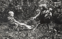 At the house number 168 'on the playground' in Hradec nad Moravicí. Siblings (from left) Rostislava Raidová and Lubomír Soudek. Probably in the late 1940s