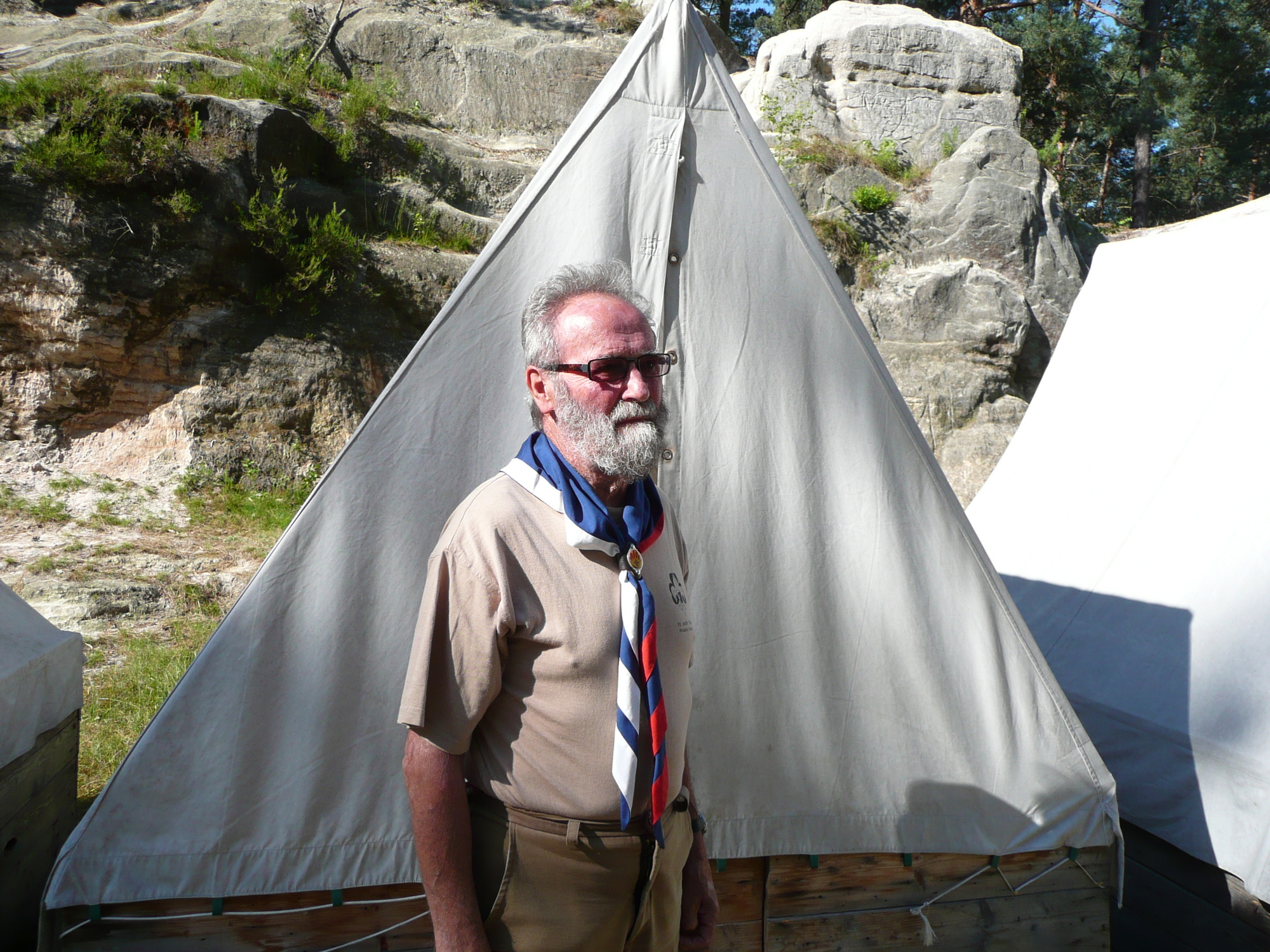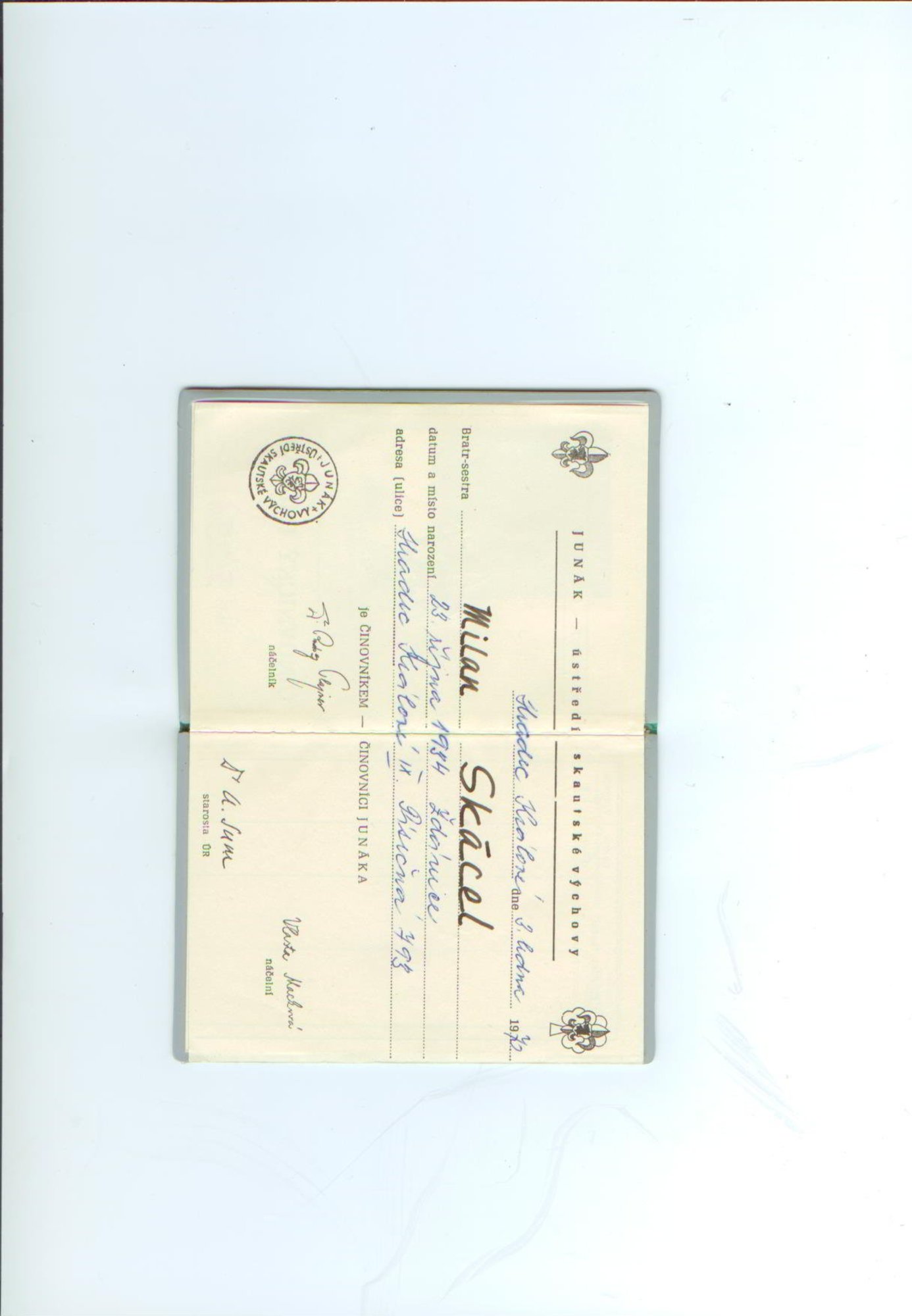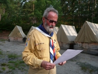 Milan Skácel - Kobra was born October 23, 1934 in Žďánice near Hodonín. After WWII he joined a Boy Scout troop (the patrol Lišky - Foxes) in Strážnice near Veselí nad Moravou. He was one of the three sons of the local higher elementary school teacher and principal. It was his older brother, who had been a Boy Scout before the war, who introduced Milan to Scouting. In 1946 and 1947 he participated in camps in the Moon Valley in the Carpathian Mountains. The ban on Scouting and the political transformation after 1948 did not hit them as severely as the Scouts in Prague; he and his friends kept meeting in pubs and tramping together. He studied the military academy in Nové Mesto nad Váhom and then worked as a professional soldier for nine years in the communications regiment in Pardubice. He married and during the restoration of Scouting in 1968 he and his wife moved from Pardubice to Hradec Králové, where he joined the 18th troop. After two years of activity and two camps in Muchov (under the village of Nebeská Rybná on the river Zdobnice in Eagle Mountains) their troop became disbanded. Milan Skácel was dismissed from the party and from his job in 1974 due to illegal operation of a radio station. In 1989, as an Oldscout and official, he took part in the third restoration of Scouting, which in his eyes was not as joyful as the one in 1968. He and his wife have worked for the Czech Scouting movement on the international level.