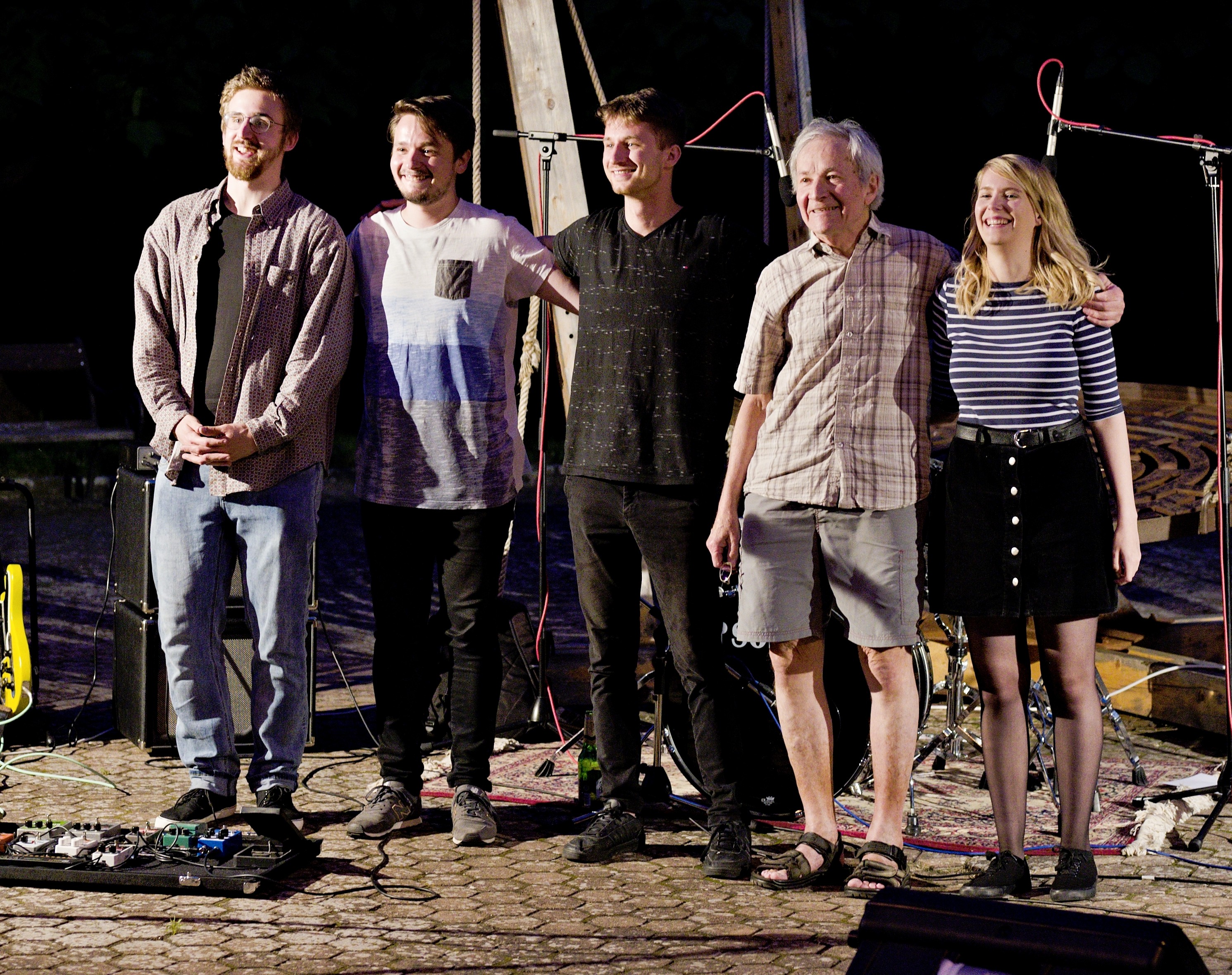 The end of the Dragon's Brew performance in front of the Drak Theatre, Jiří Vyšohlíd Sr. (second from right), Jiří Vyšohlíd Jr. (second from left), 2015, Hradec Králové
